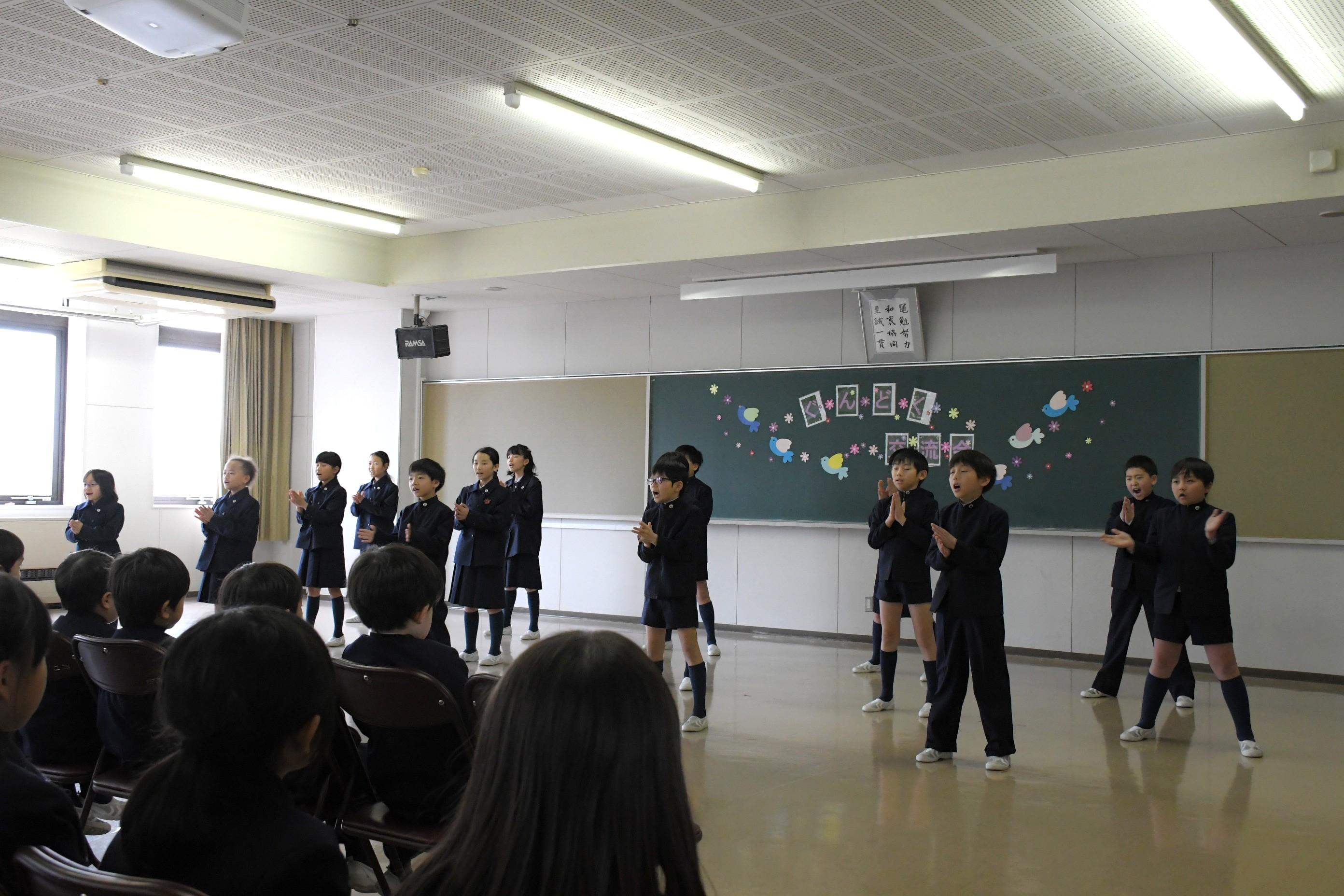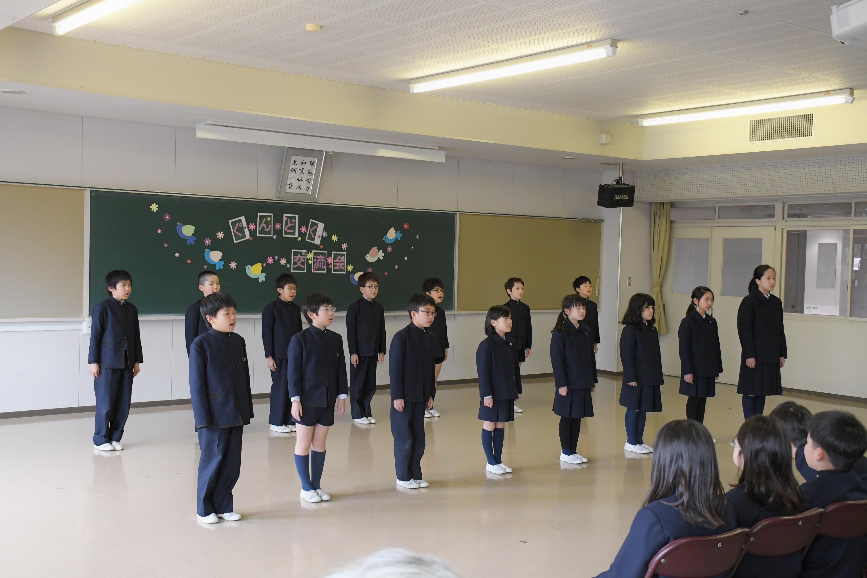 1・2・3・4年生で群読交流会を行いました。各学年のカラーが存分に出た発表で、他学年だけでなく、たくさんの先生や卒業生の拍手を受けました。頑張って練習した成果を見せることができ、子どもたちは、満足げな表情を浮かべていました。