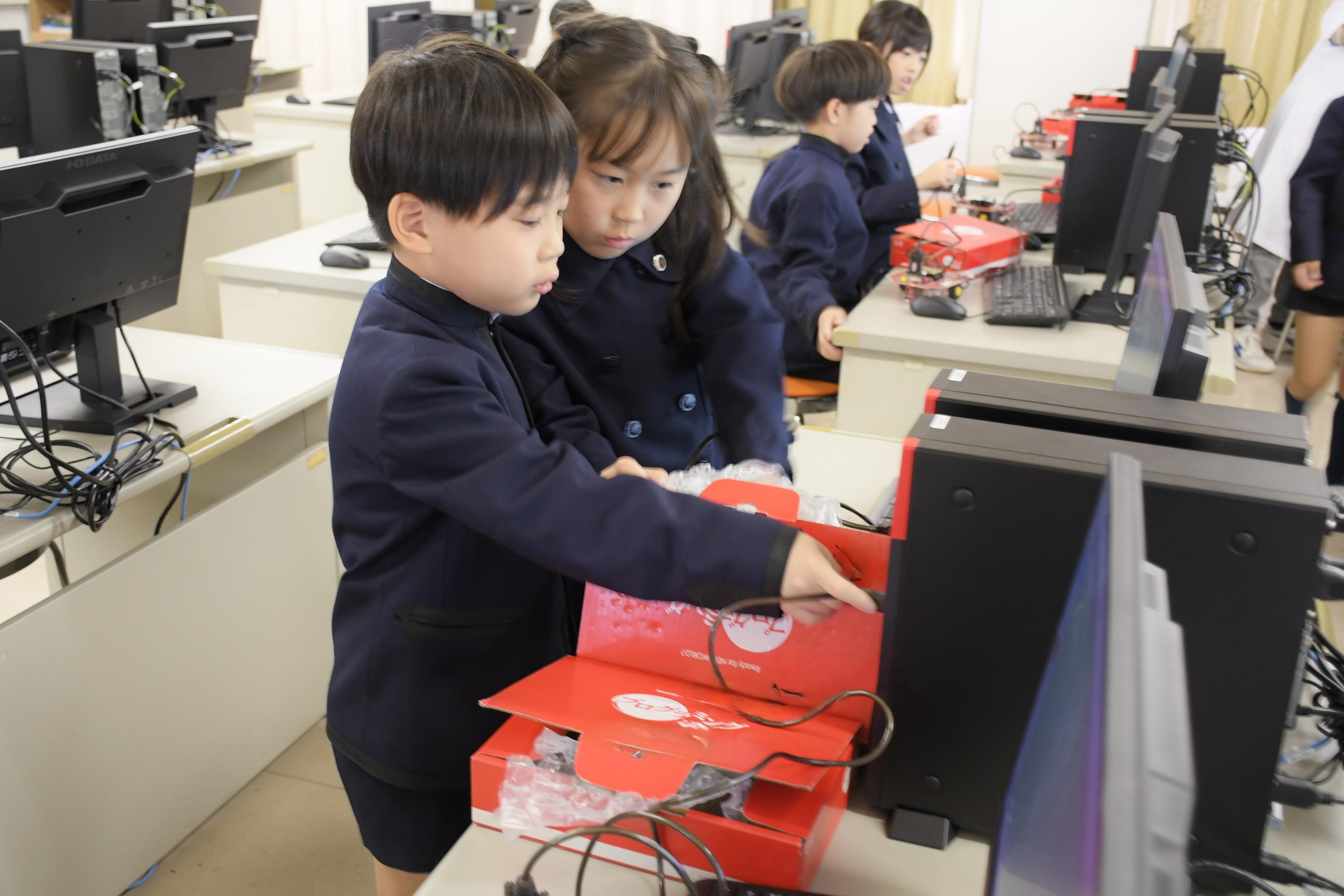 火曜日のアフタースクールは、ロボットプログラミング。自分で考えて作ったプログラミングでロボットを動かします。思い通りにいかなくても何度も挑戦する気持ちや知的好奇心を育みます。