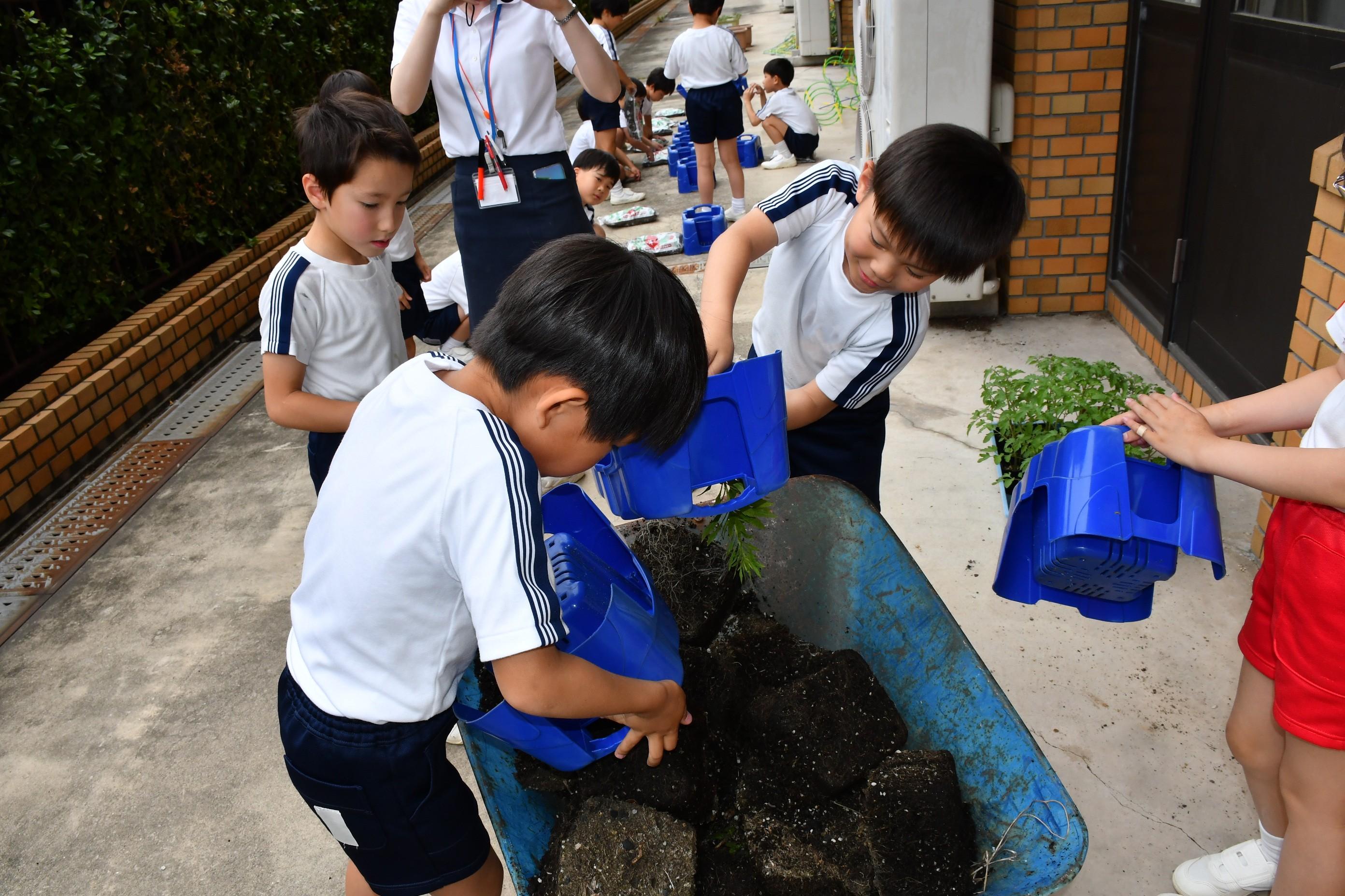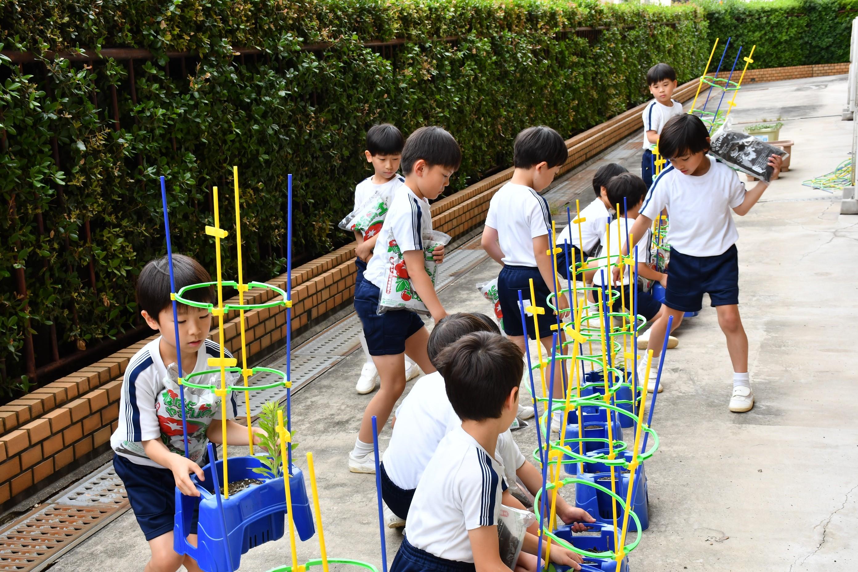 2年生は、一人一鉢ミニトマトの苗を植えました。
