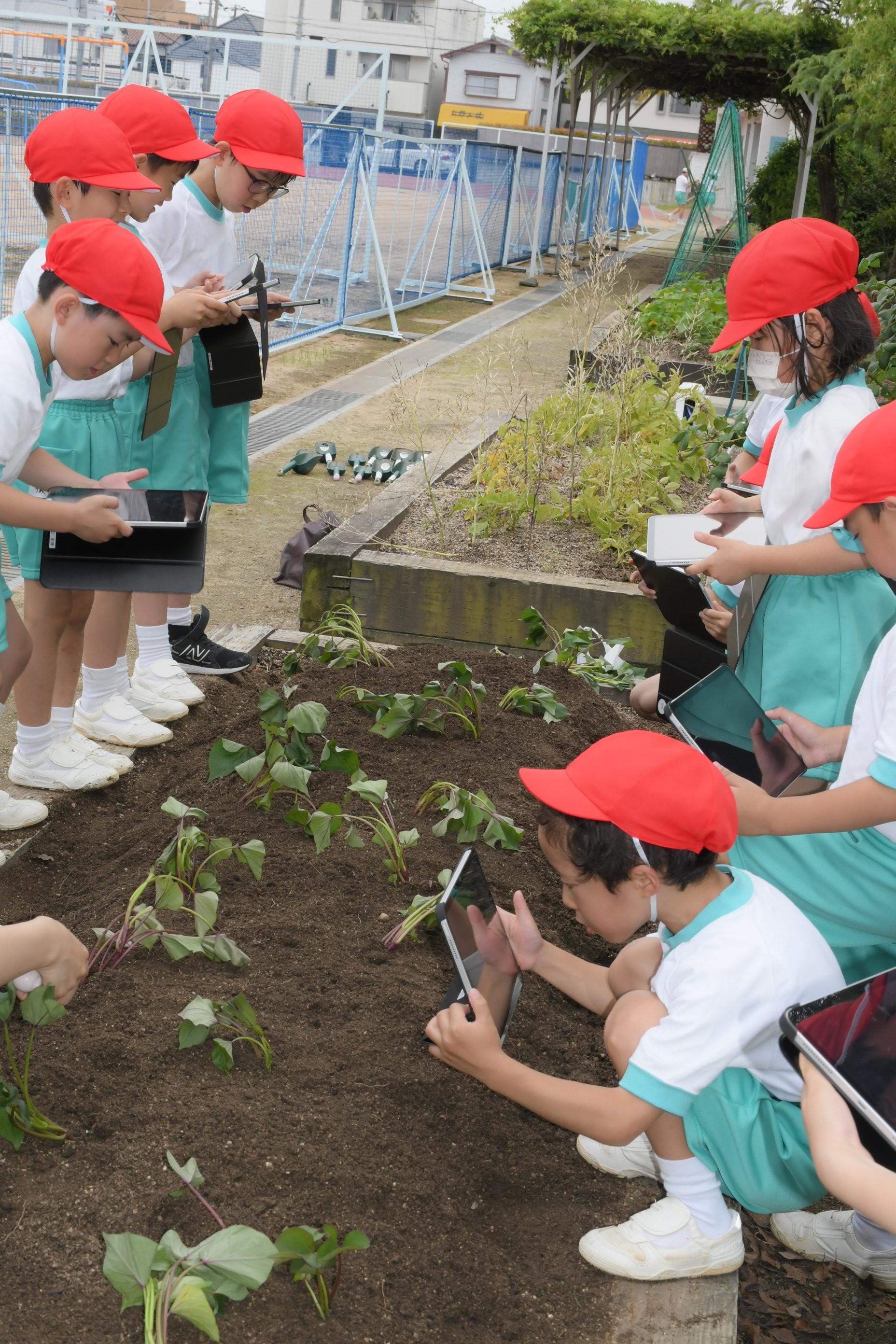 1年生は、さつまいもの苗を植えました。においを嗅いだり、触ったり、じっくり見たり、しっかり観察をしてから植えました。