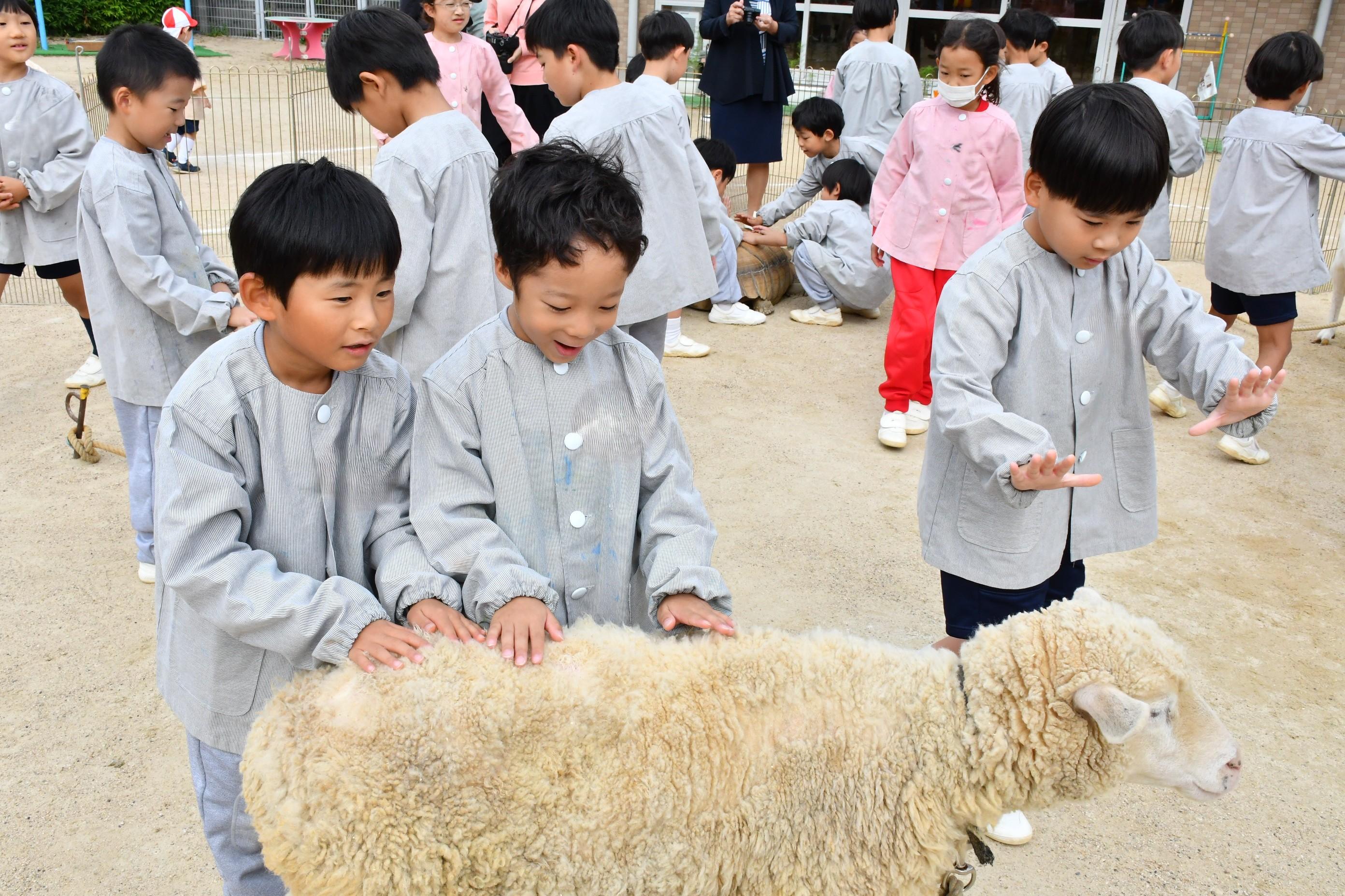 甲子園学院幼稚園の園庭にふれあい動物村がやってきました。ウサギやヒツジ、ヤギなど、たくさんの動物が来てくれました。