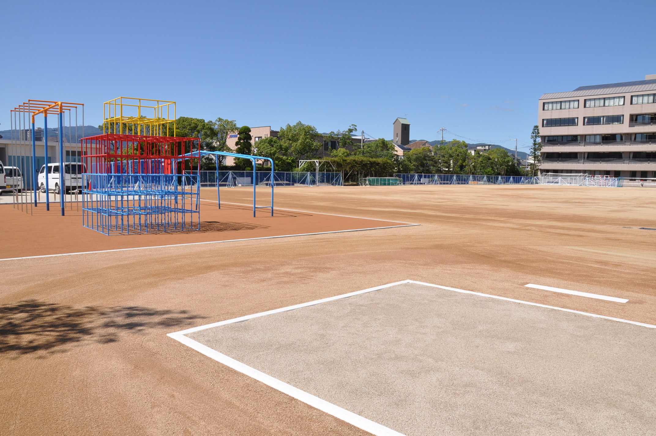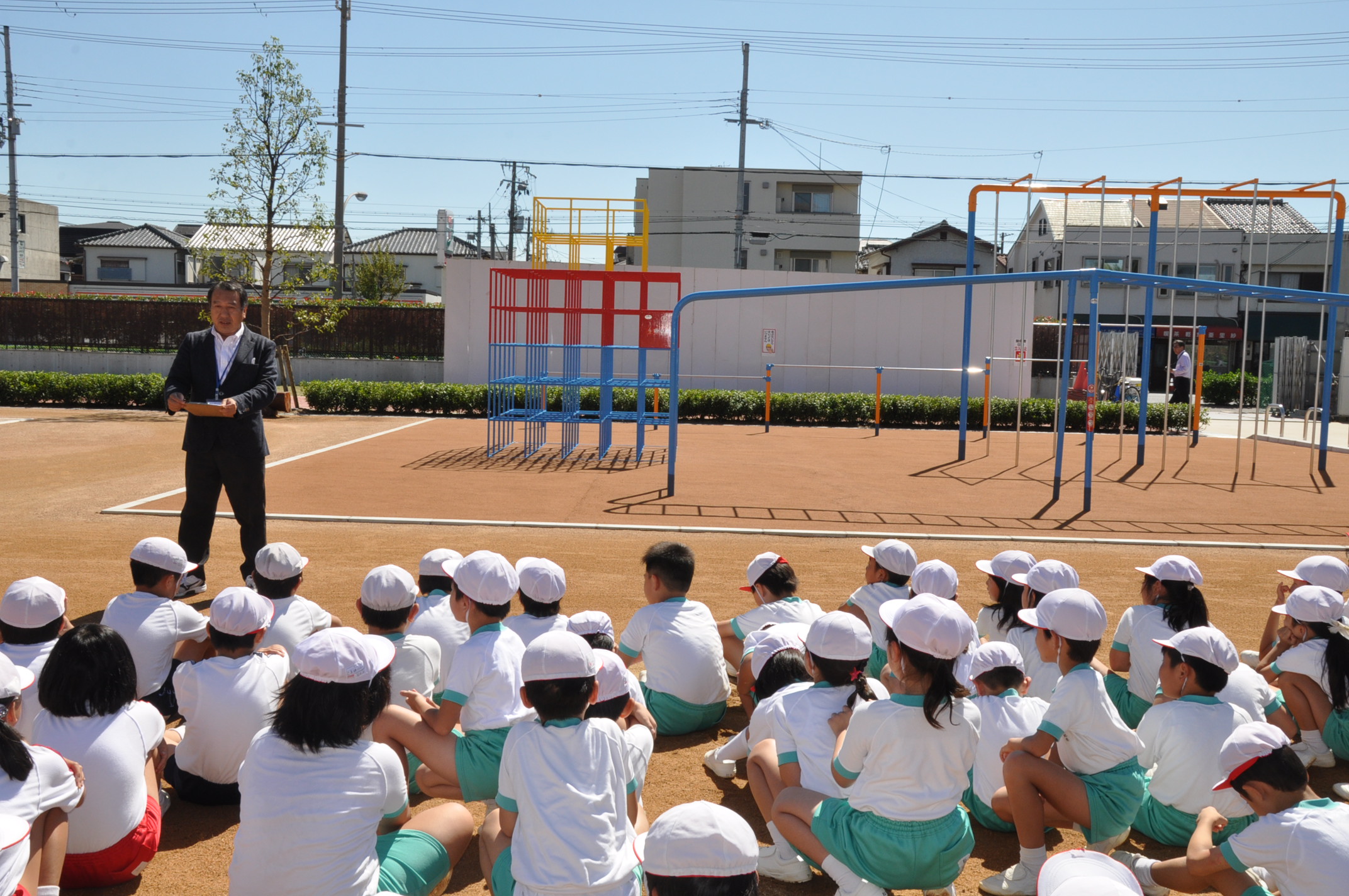 グラウンドが新しくなりました! [投稿日:2018年09月28日] 昨年から行われていましたグラウンドの工事が本日ほぼ完了しました。遊具や倉庫、学級園、トイレなどが新設され子どもたちは大喜びでした。校長先生から、遊具やトイレなどの使い方や安全面の話を聞いたあと、早速遊具を使って遊びました。遊具の下には、弾力性のあるゴムチップが全面に敷かれ、安心して活動できます。 一覧へ戻る