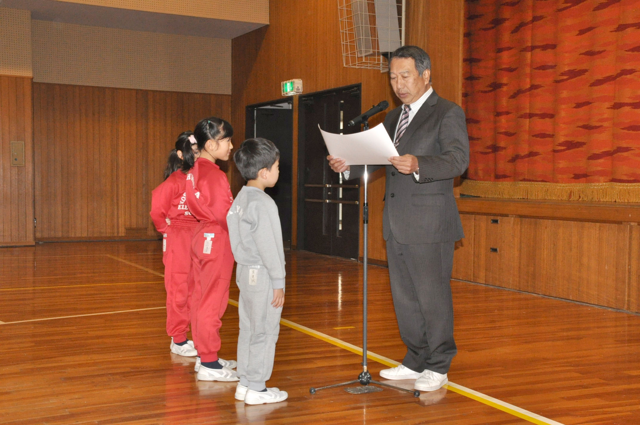 平成30年11月26日(月),朝の児童朝礼で,私学の書展に出展された3名の表彰を行いました。