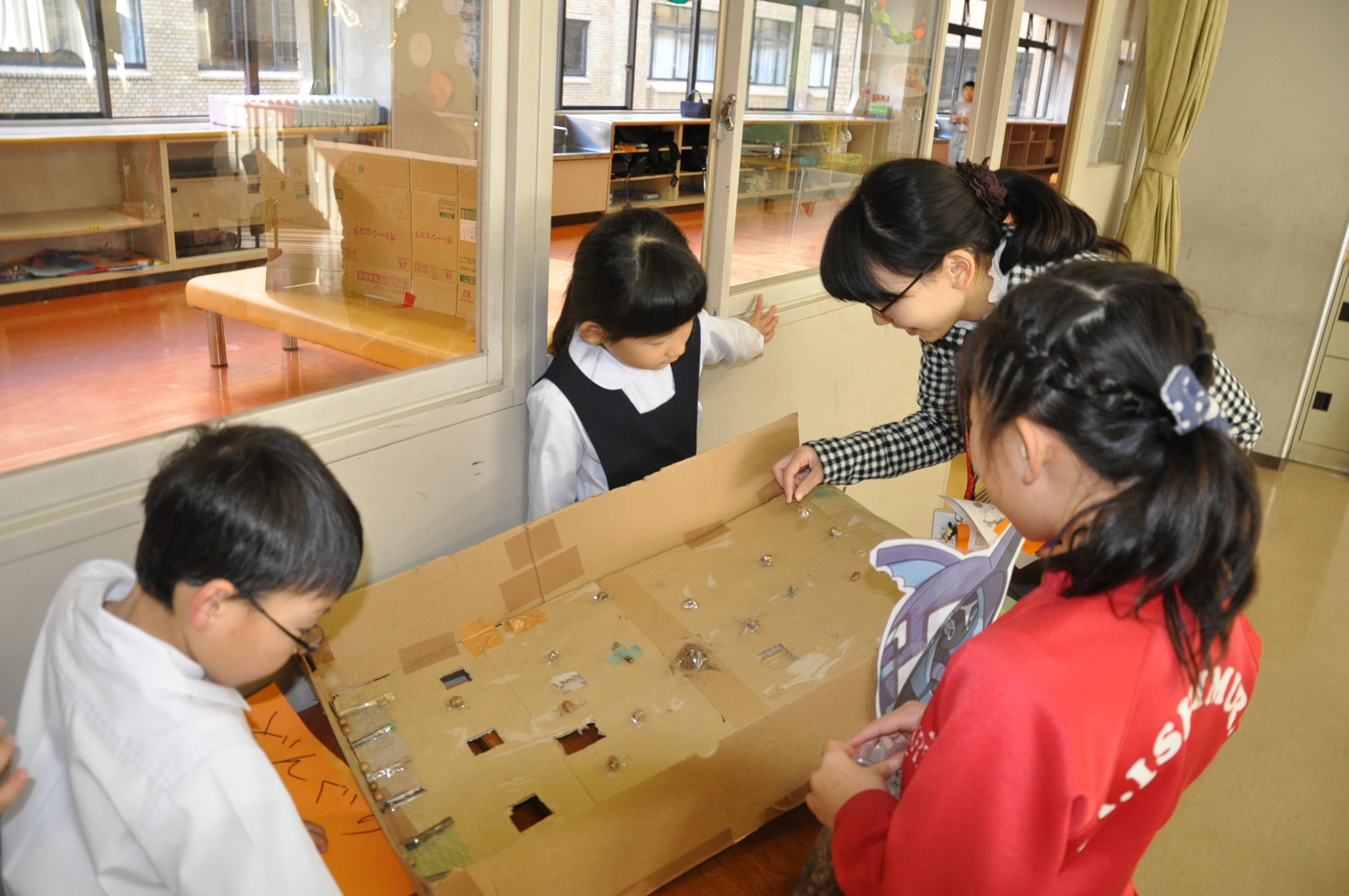 1年生・6年生や先生方をおまつりに招待して、秋や冬のいろいろなものを取り入れたゲームを行いました。