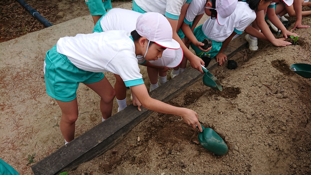 5年生 理科「 カボチャの植え替え」 [投稿日:2019年06月14日] 令和元年6月14日(金),理科の時間に5年生が,おもちゃカボチャの苗を学級園に植え替えました。 秋に実るのが楽しみです。 一覧へ戻る