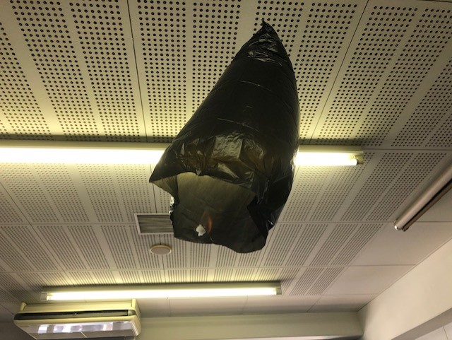 熱伝導の実験。金属など固体での伝導率を調べたあと、熱気球の仕組みを利用して、理科室でポリ袋を飛ばしました。