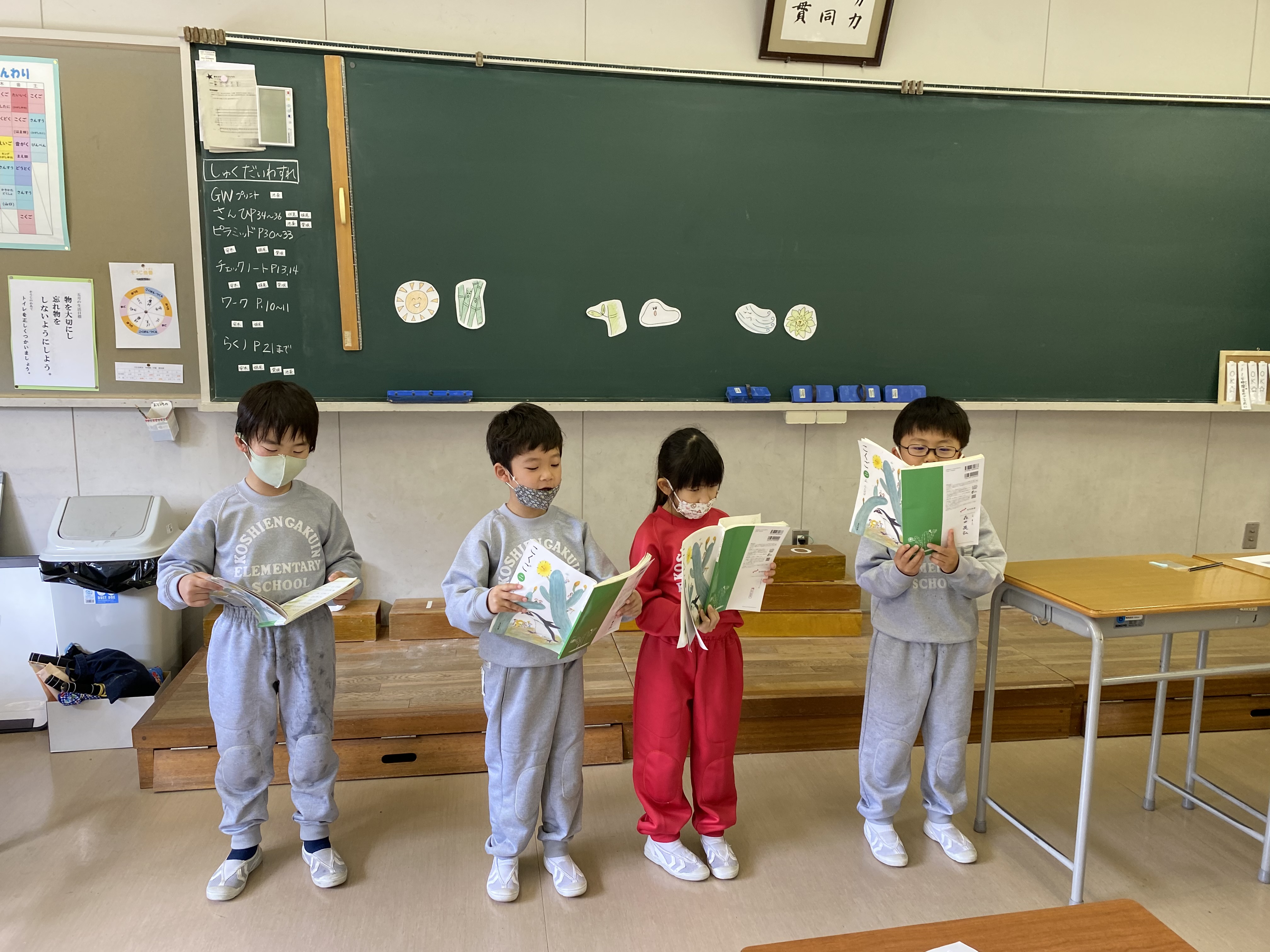 国語科では、4月から練習をがんばっていた「ふきのとう」の音読発表会をしました。自分の役になり切って上手に読めていました。