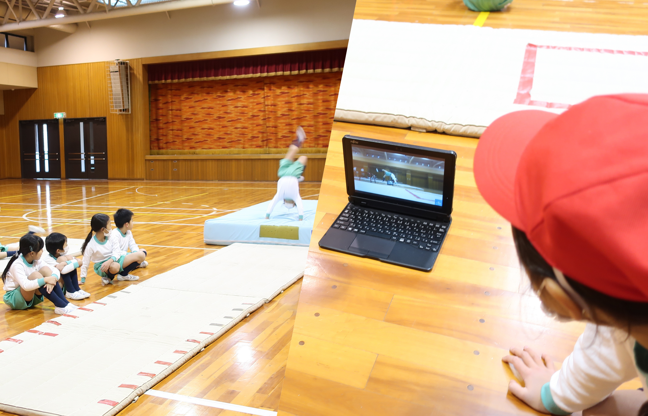 体育のマット運動と跳び箱では、個々の目標に向かって一生懸命に練習する姿が見られました。