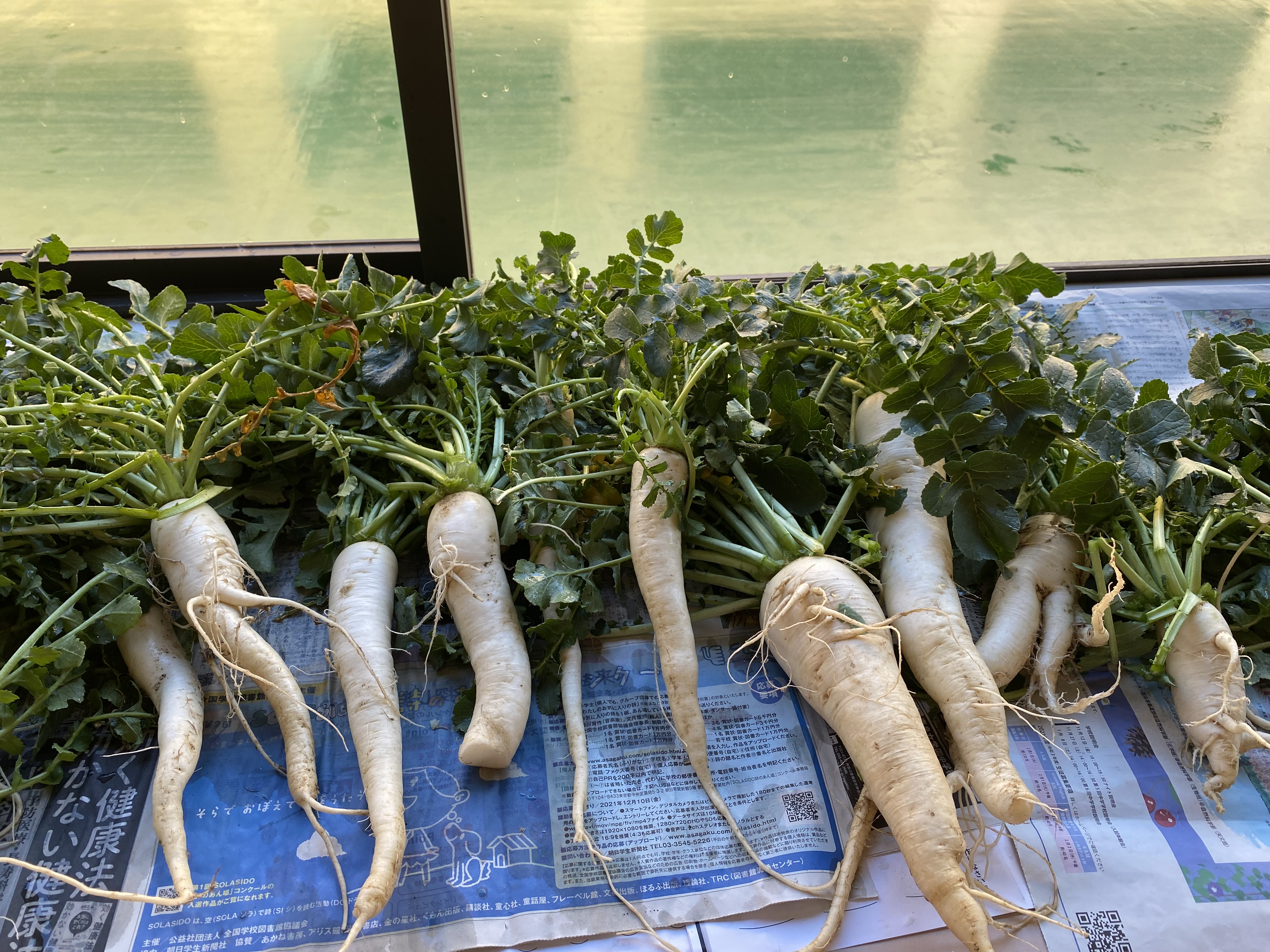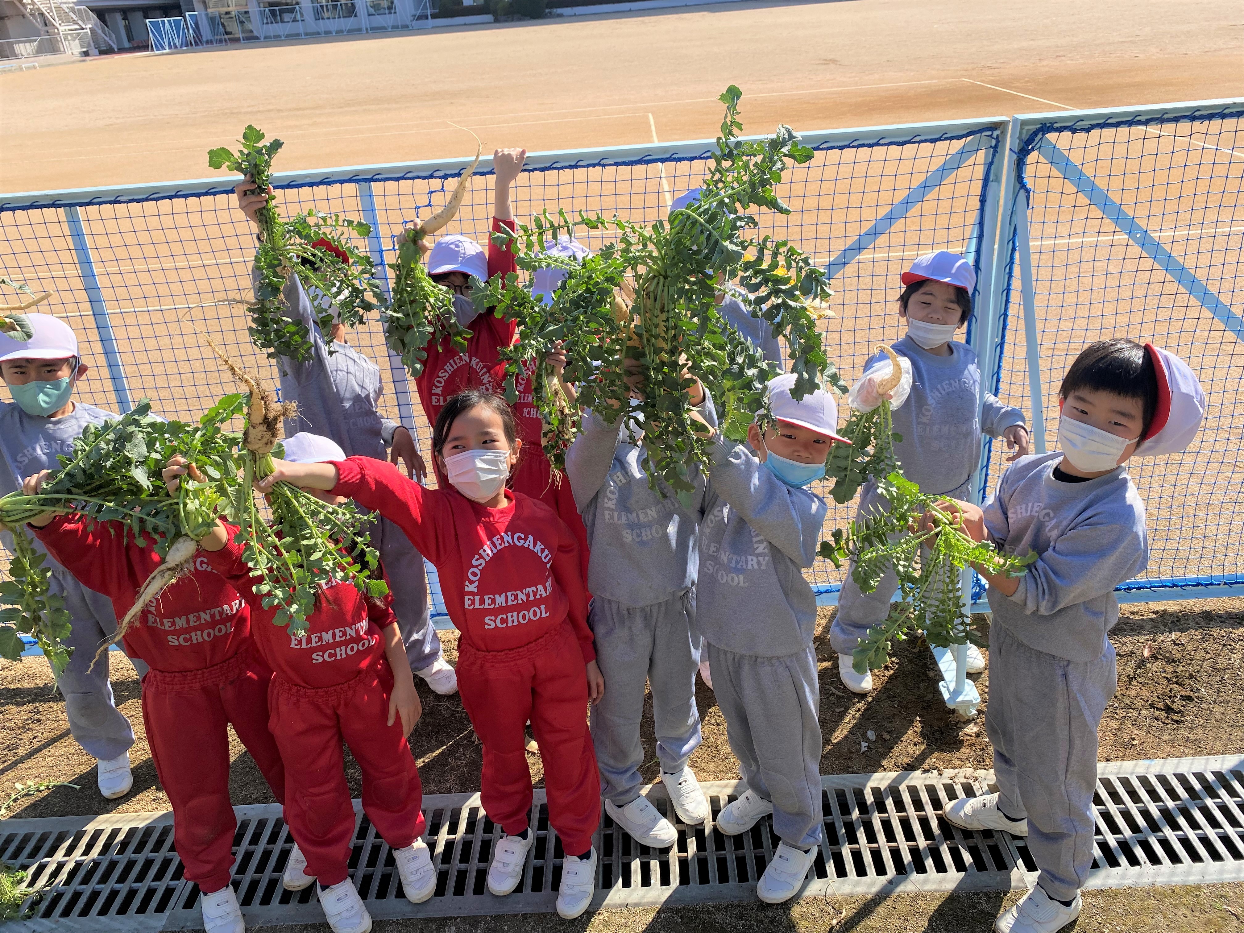2年生 生活科「大根の収穫」 [投稿日:2022年03月13日] 秋から育てていた大根を収穫しました。予想以上に成長した大根を見て子ども達も嬉しそうでした。「なかなかぬけなーい!」と力を合わせて引き抜く姿がかわいらしかったです。 一覧へ戻る