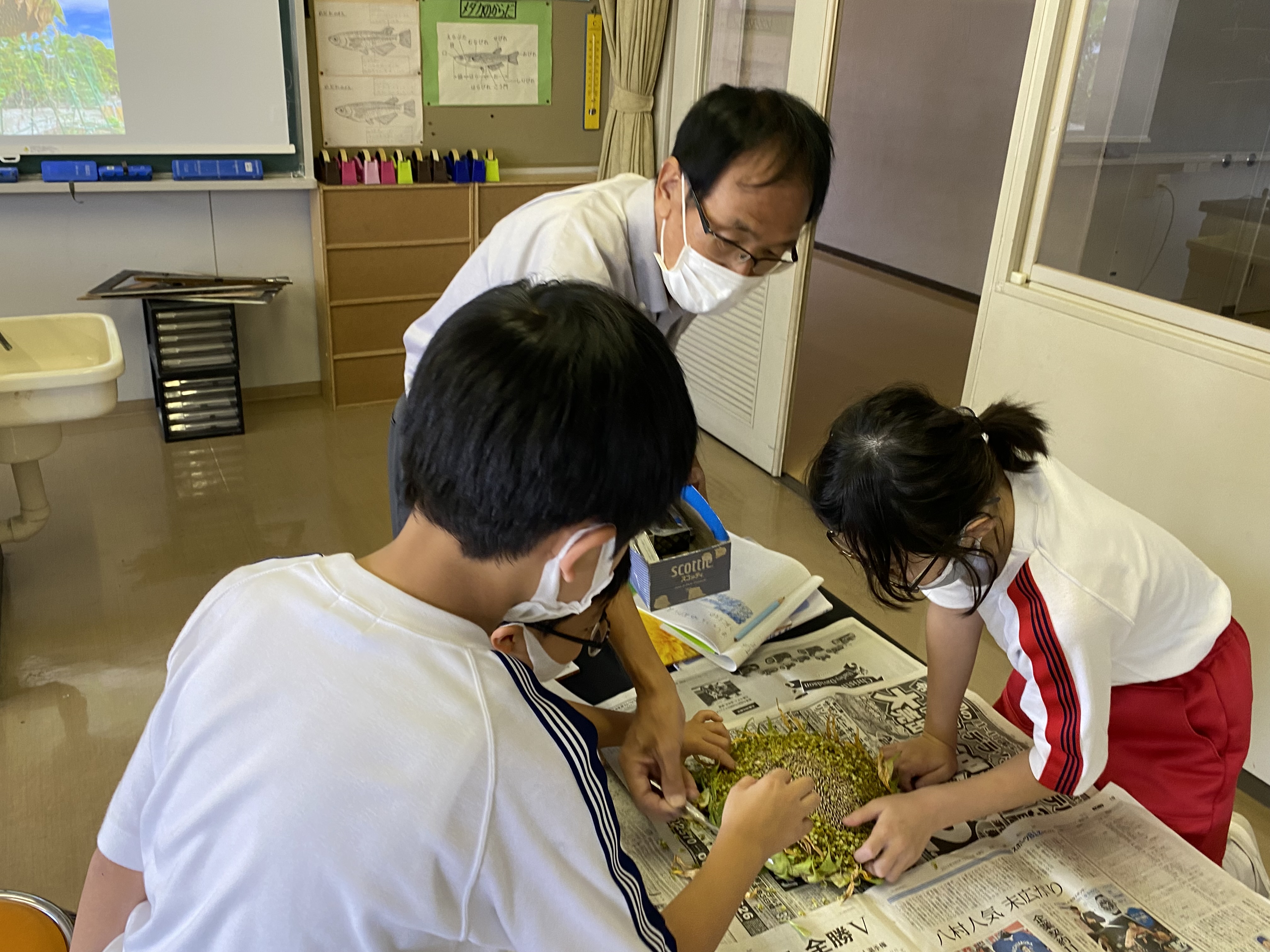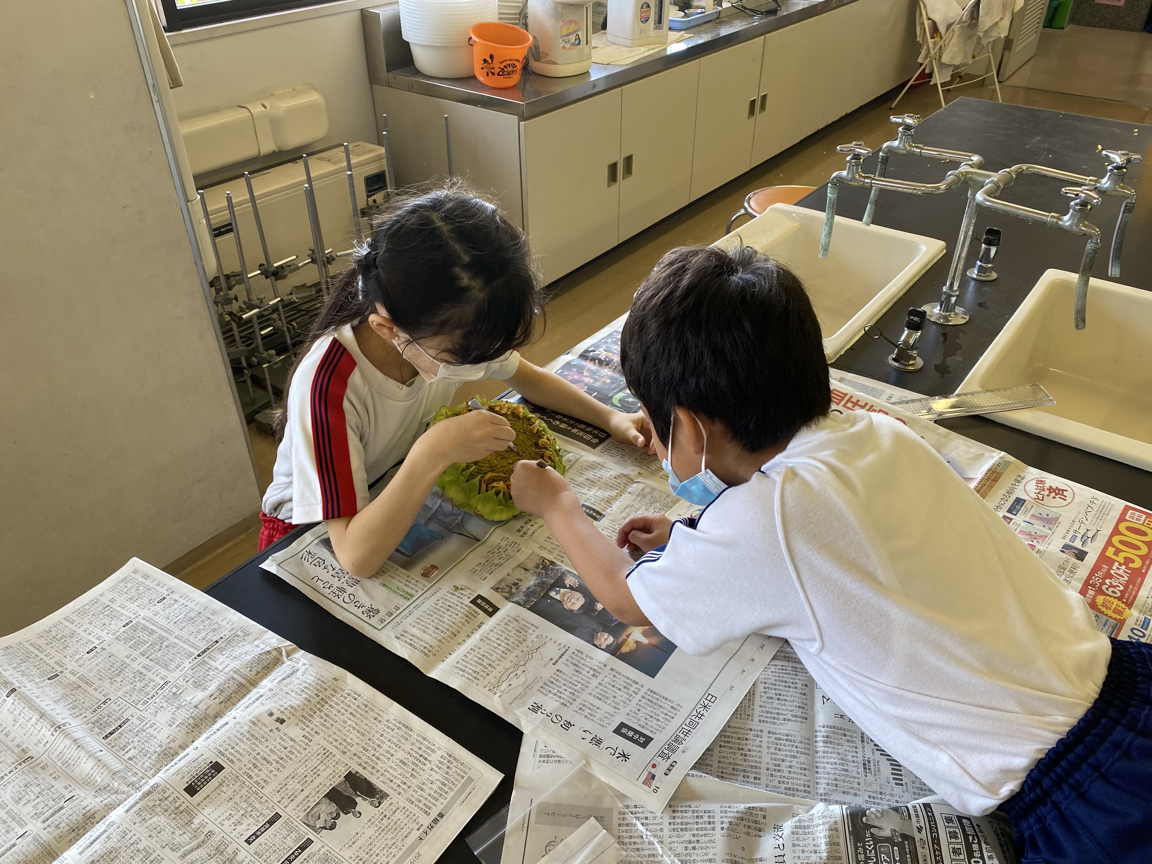 5月に植えたひまわりを収穫し、花の直径を定規で測ったり、たねの個数を数えたりしました。地道に一粒ずつ数え、ある班では、およそ2000個あるという結果を導き出しました。