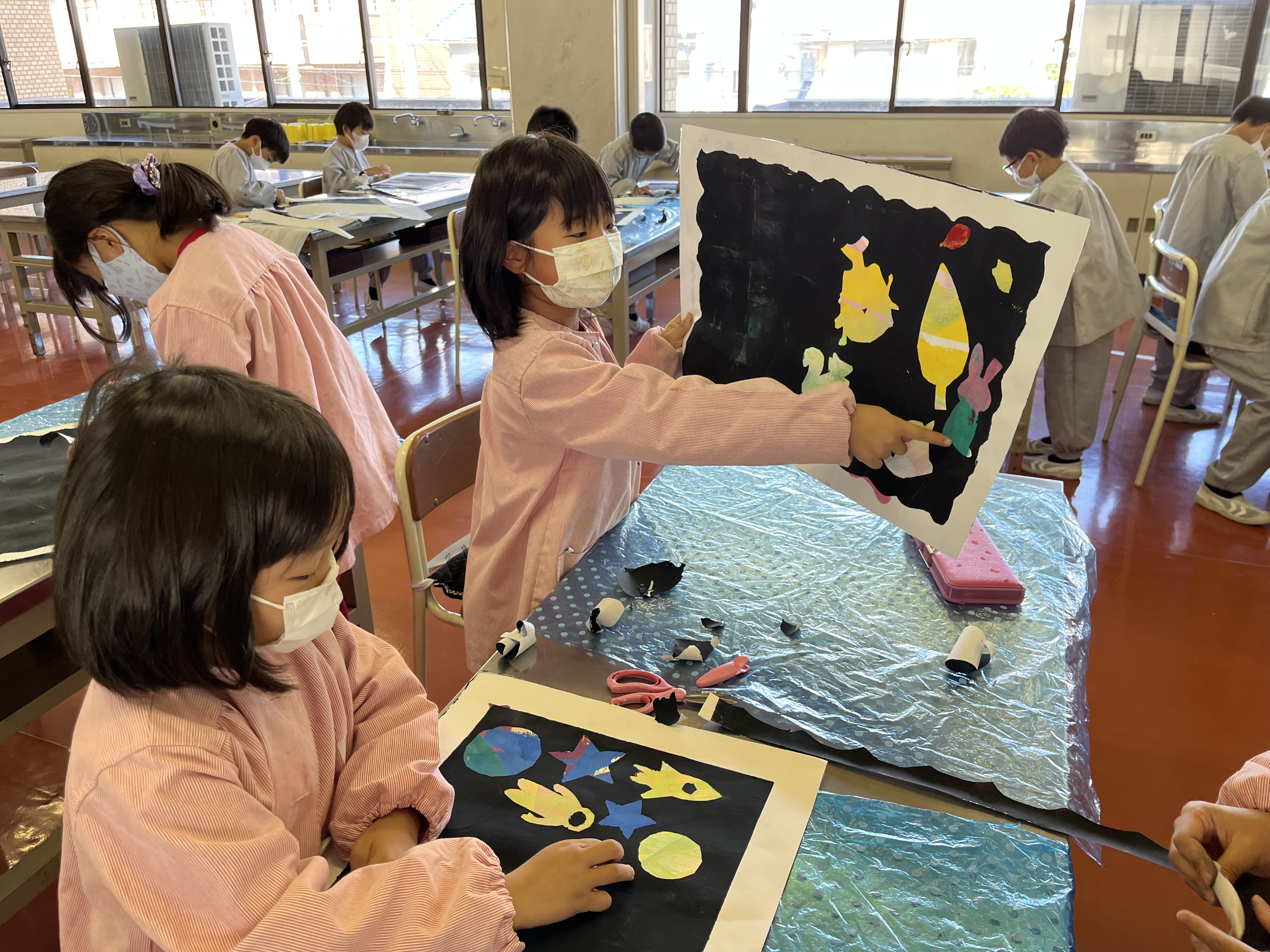 図工では、ステンシル版画をしました。カラフルな色を塗った画用紙に自分の好きなシールを貼っていきます。