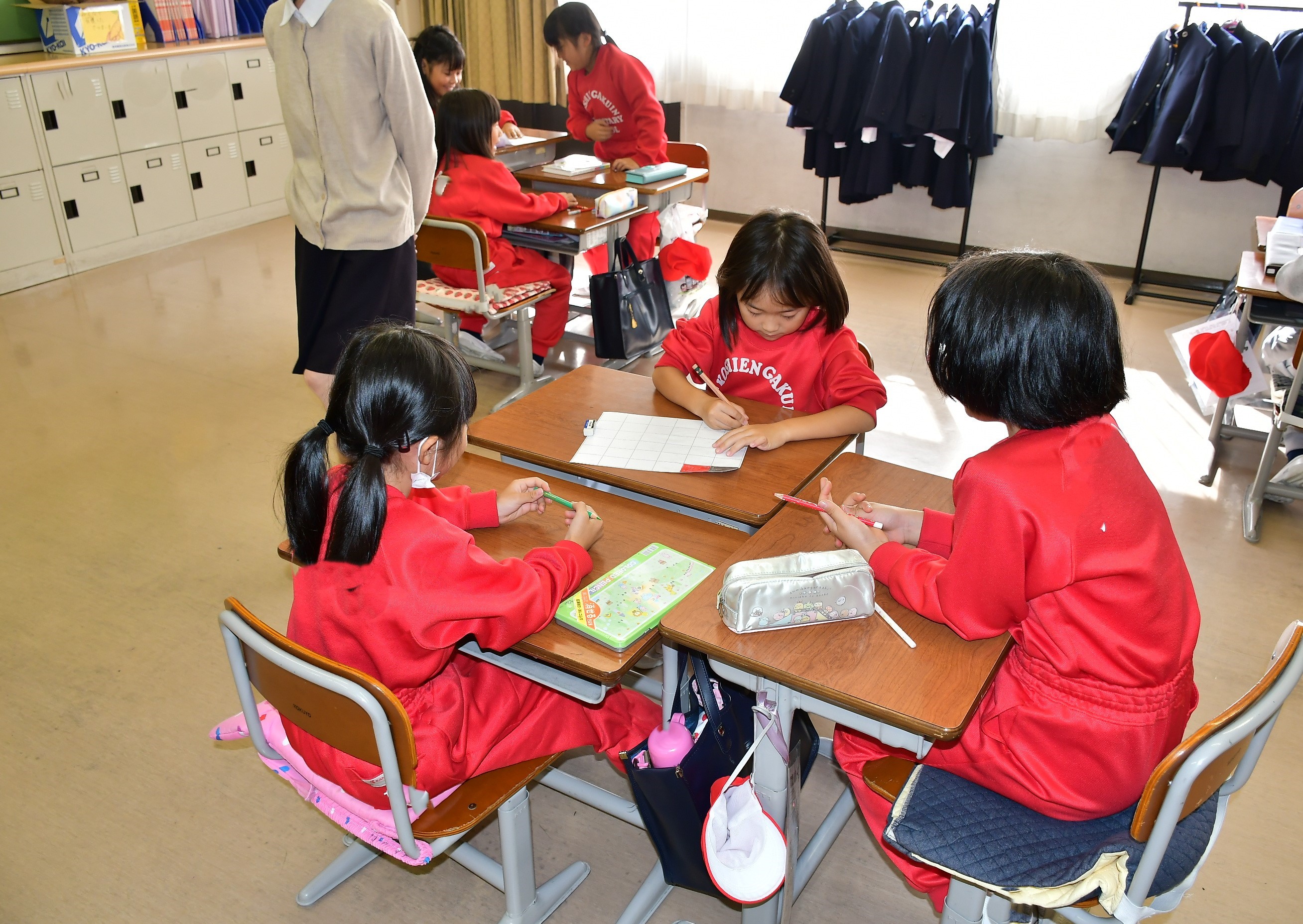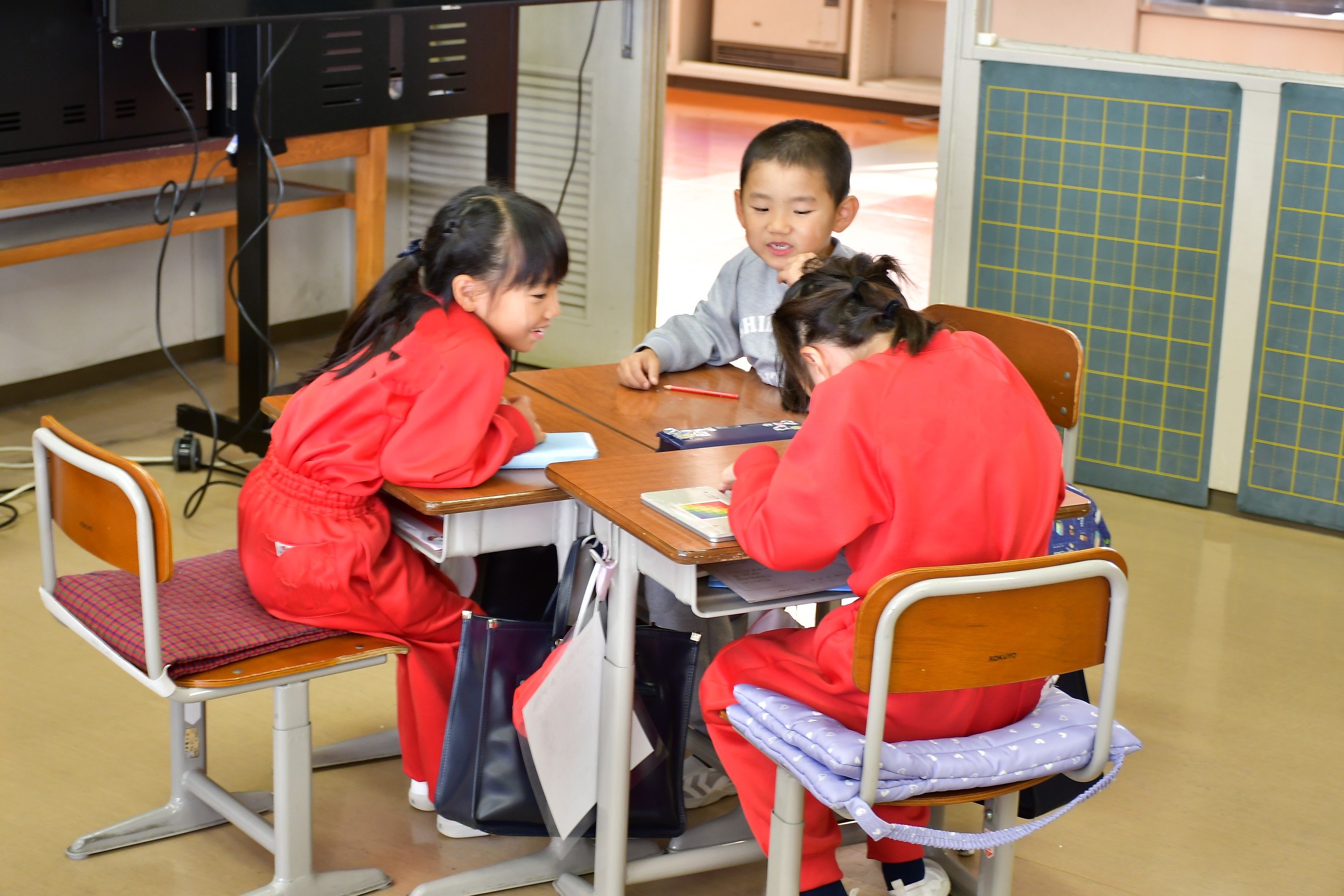 間接比較の勉強として、陣取りゲームを行いました。じゃんけんに勝った人が自分の色を塗り、その広さの差を求めました。ゲーム形式の授業でしたが、勝ち負けにこだわらず、伸び伸びと取り組んでいました。