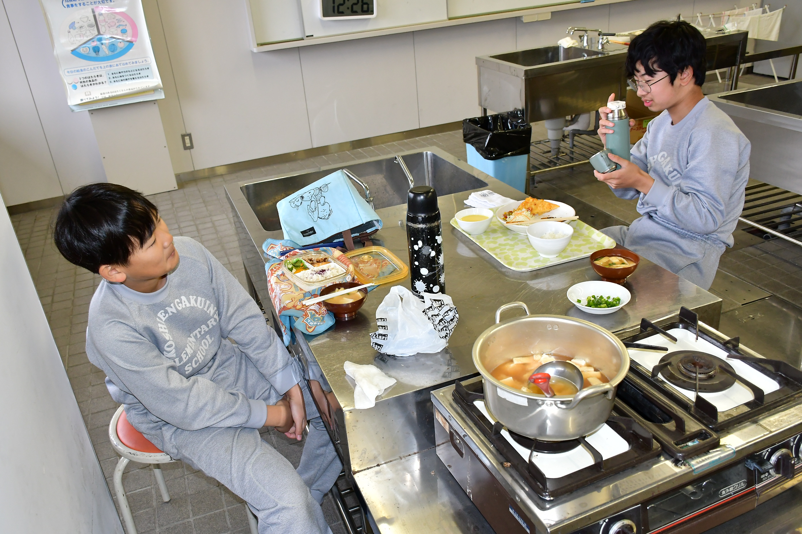 6年生は家庭科でお味噌汁を作りました。だしの取り方や具材の切り方など、学習した内容を実践しました。具材は各班が話し合い各自で持ち寄ったため、個性豊かなお味噌汁となりました。