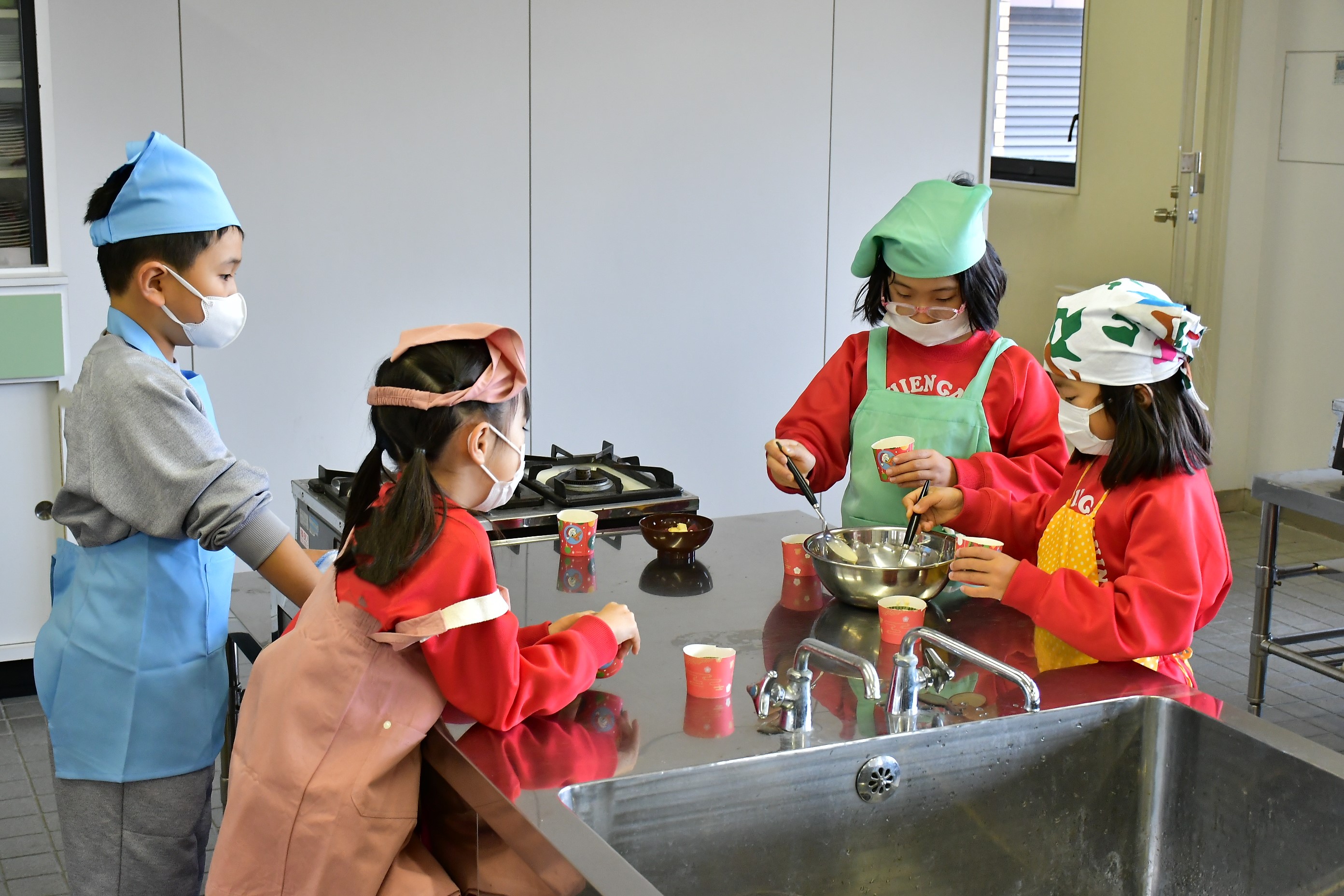 6月初旬にさつまいもの苗を植え、およそ半年後… 学級園で栽培したさつまいもを収穫しました。今夏の猛暑や降雨量の少なさからあまり大きなさつまいもを収穫することは叶いませんでした。それでも子どもたちは、収穫できた喜びを感じていました。そして、本日さつまいもを使って蒸しパン作りを行いました。丁寧に生地をカップに流しこみました。蒸されてできたパンを一口。子どもたちは「おいしい!」「あまーい!」と喜んでいました。こうした経験がこれからに生かされることを願っています。