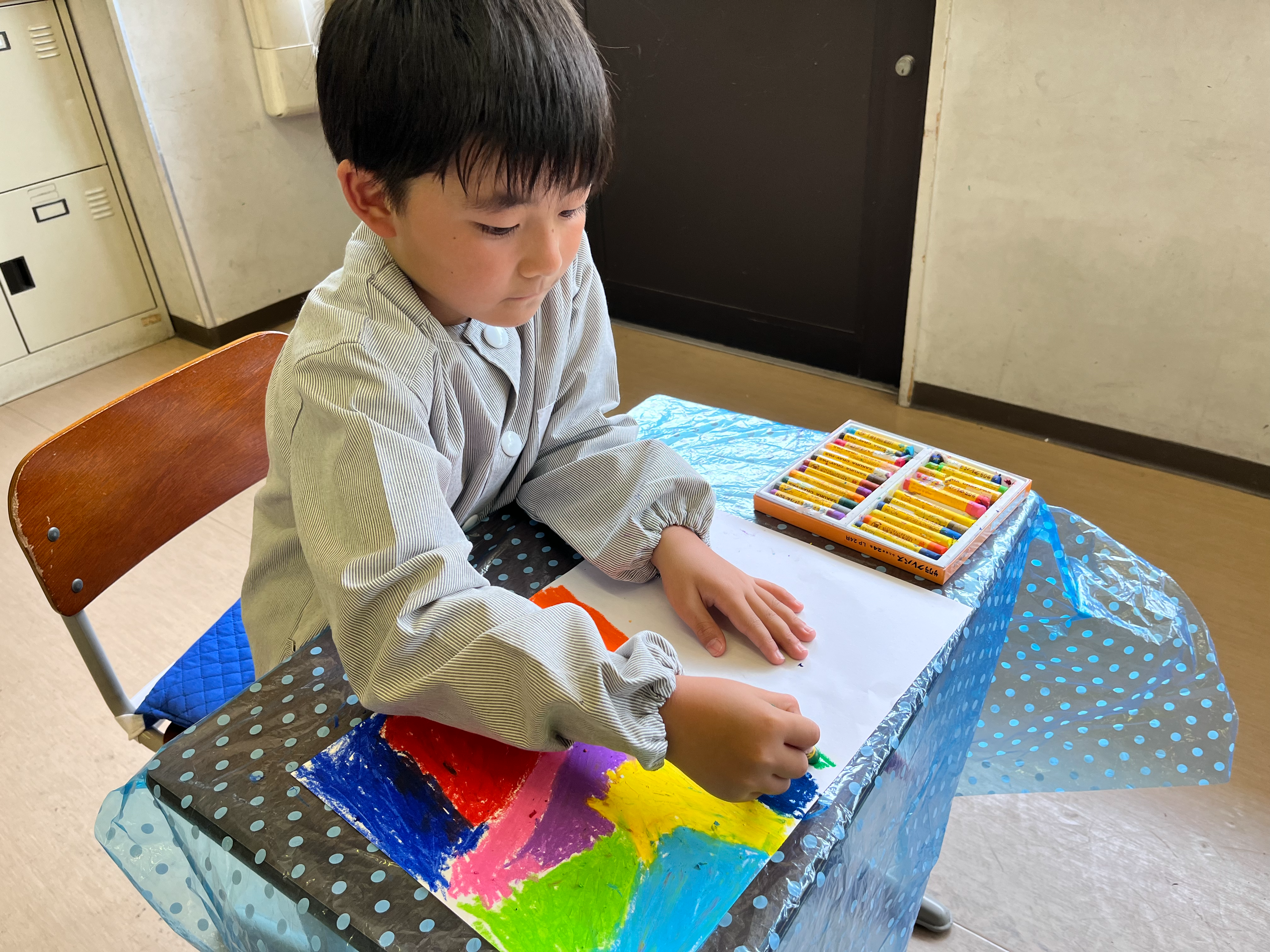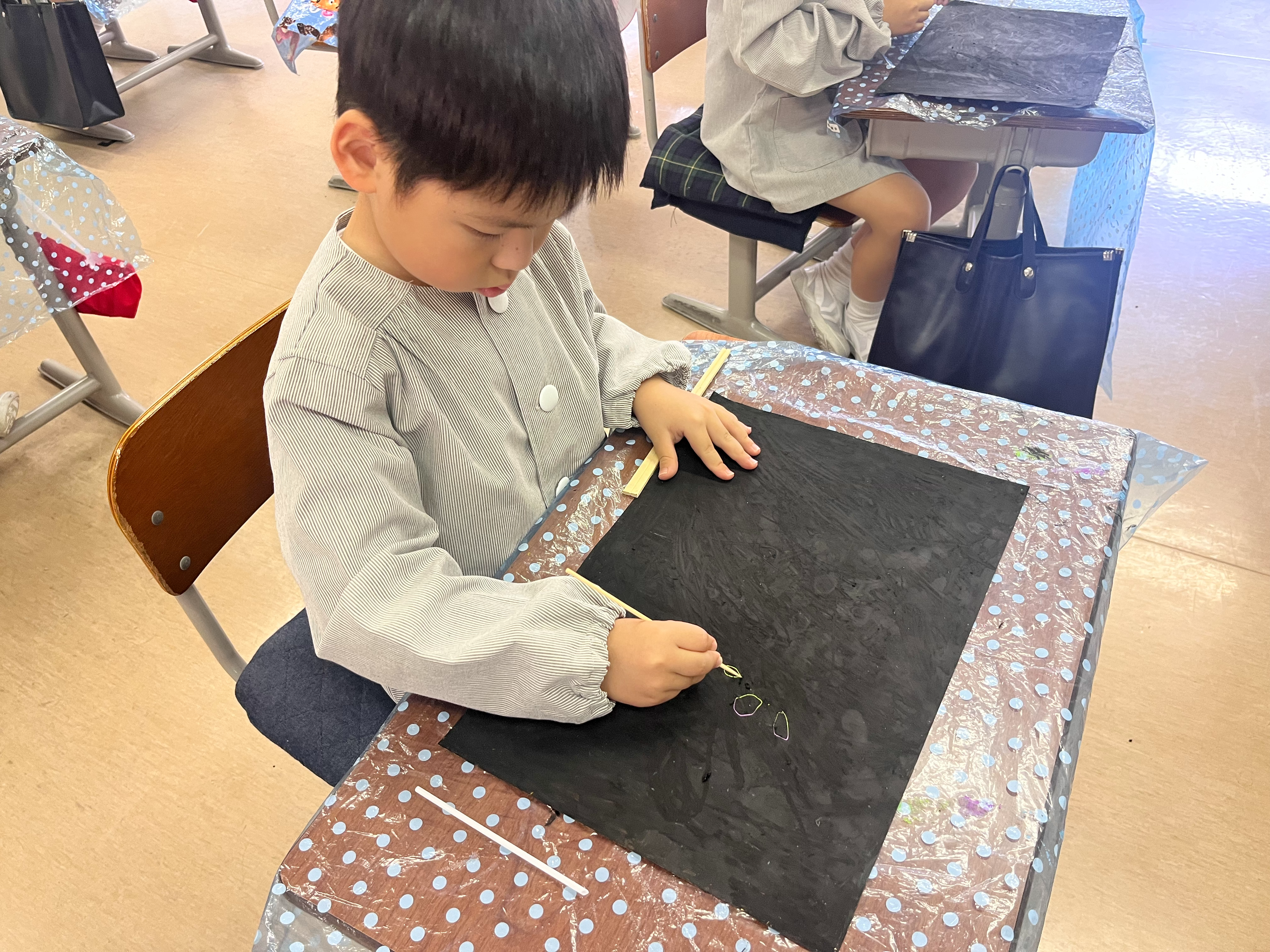 1年生は、図工科の授業でクレパスを使って削り絵をしました。大きな画用紙に隙間なく色を塗るのは大変でした。顔がまっ黒になりながらも頑張ったおかげで、きれいな花火をさかせることができました。