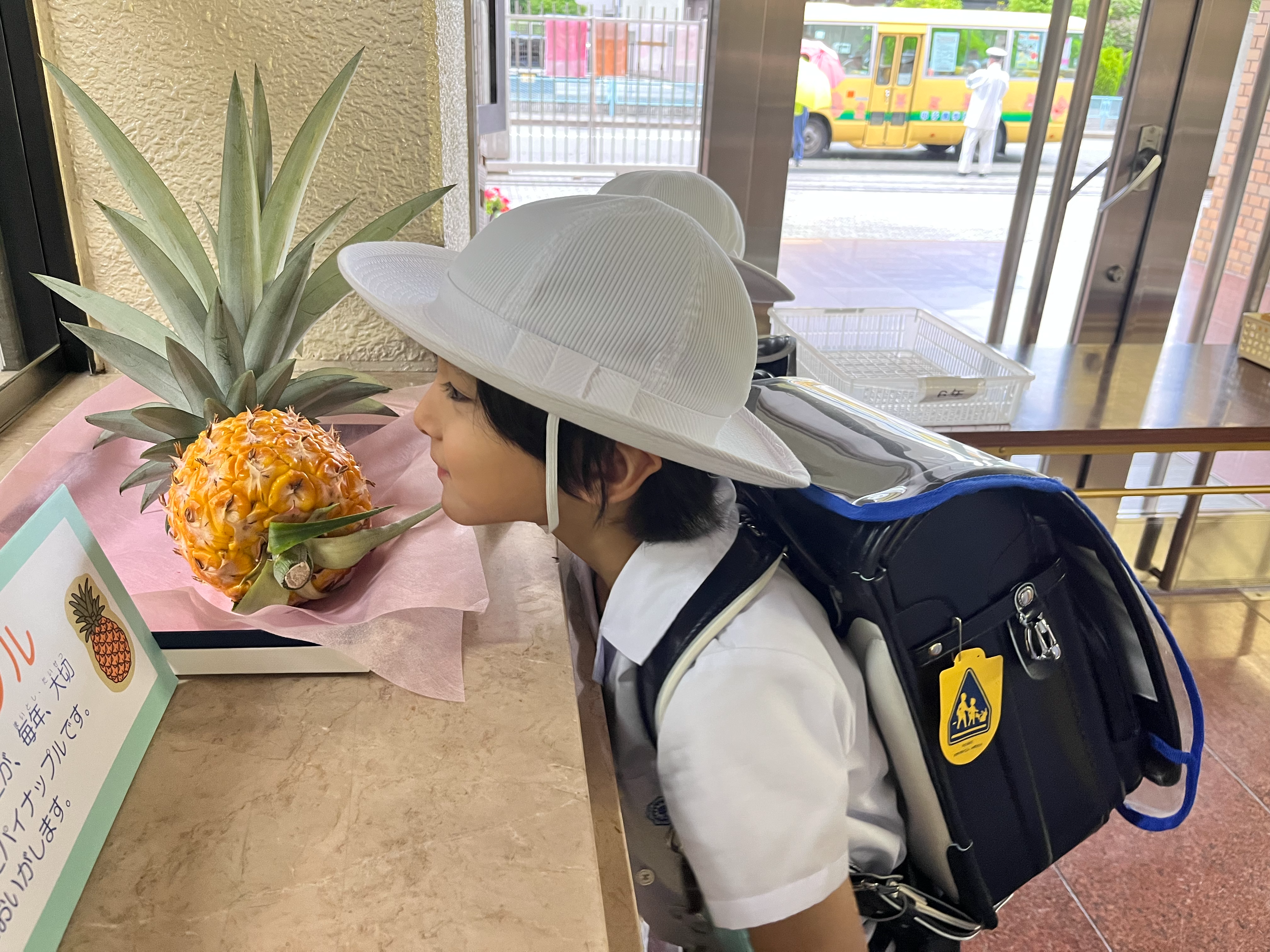 親子の集いで見たパイナップルの木からどのように実がなったのか、写真で知ることができ勉強にもなりました。職員室の前に飾られていた時から甘い匂いが漂っていて楽しみにしていたパイナップルは、とても甘くておいしかったです。