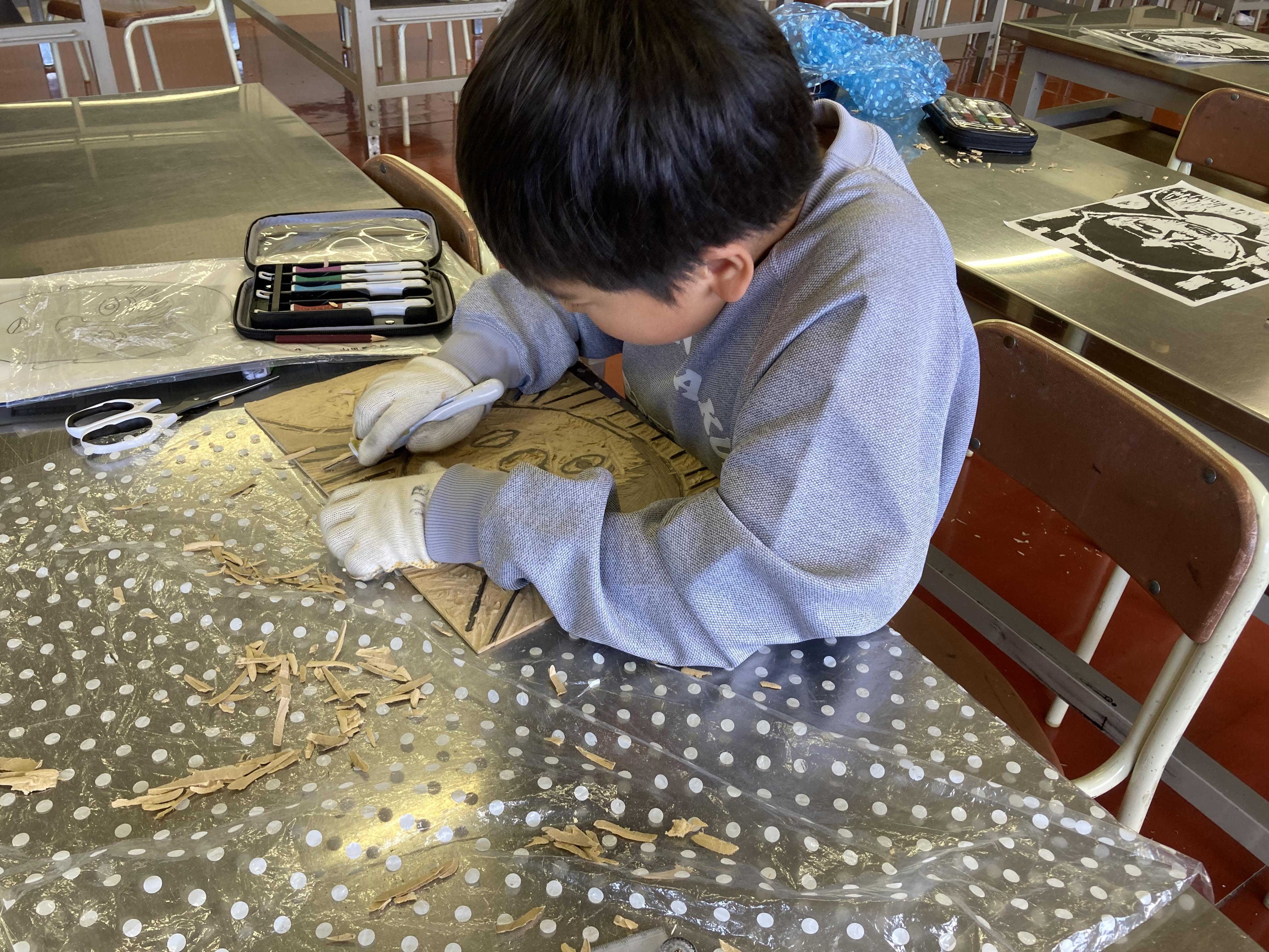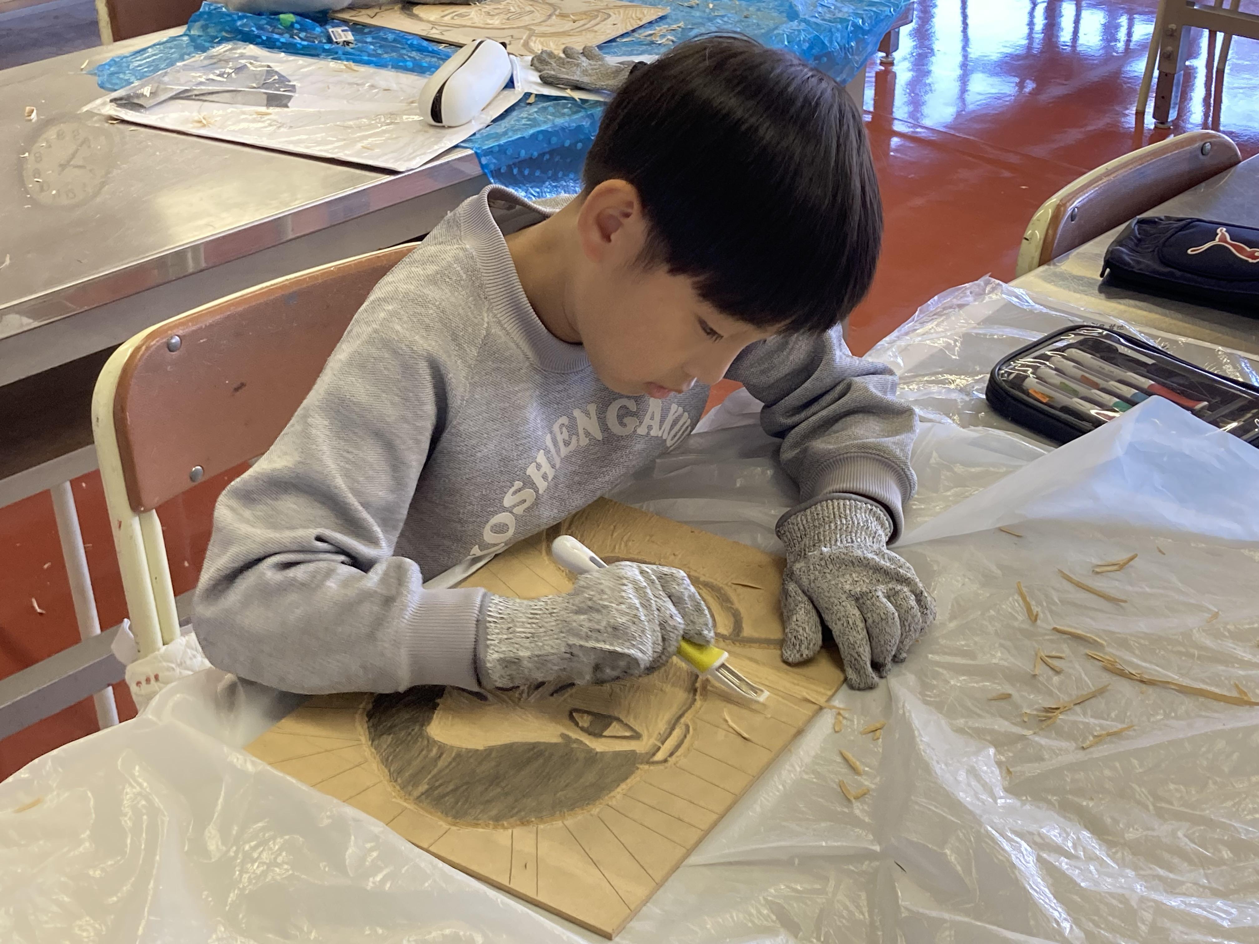 4年生は2学期より図工科で彫刻刀の学習を進めてきました。その集大成となる版画作品の制作に取り組みました。自らの顔を模写し、木版画に写し取って、彫刻刀で掘っていきます。丸刀や三角刀など合わせて5種類の彫刻刀にはそれぞれ特徴があり、考えながら掘っていく中で、子どもたちは徐々にコツをつかんだ様子でした。最後に、掘り終えた木版画にインクを付け、印刷をして完成です。完成した個性豊かな作品に、子どもたちは満足げな表情でした。