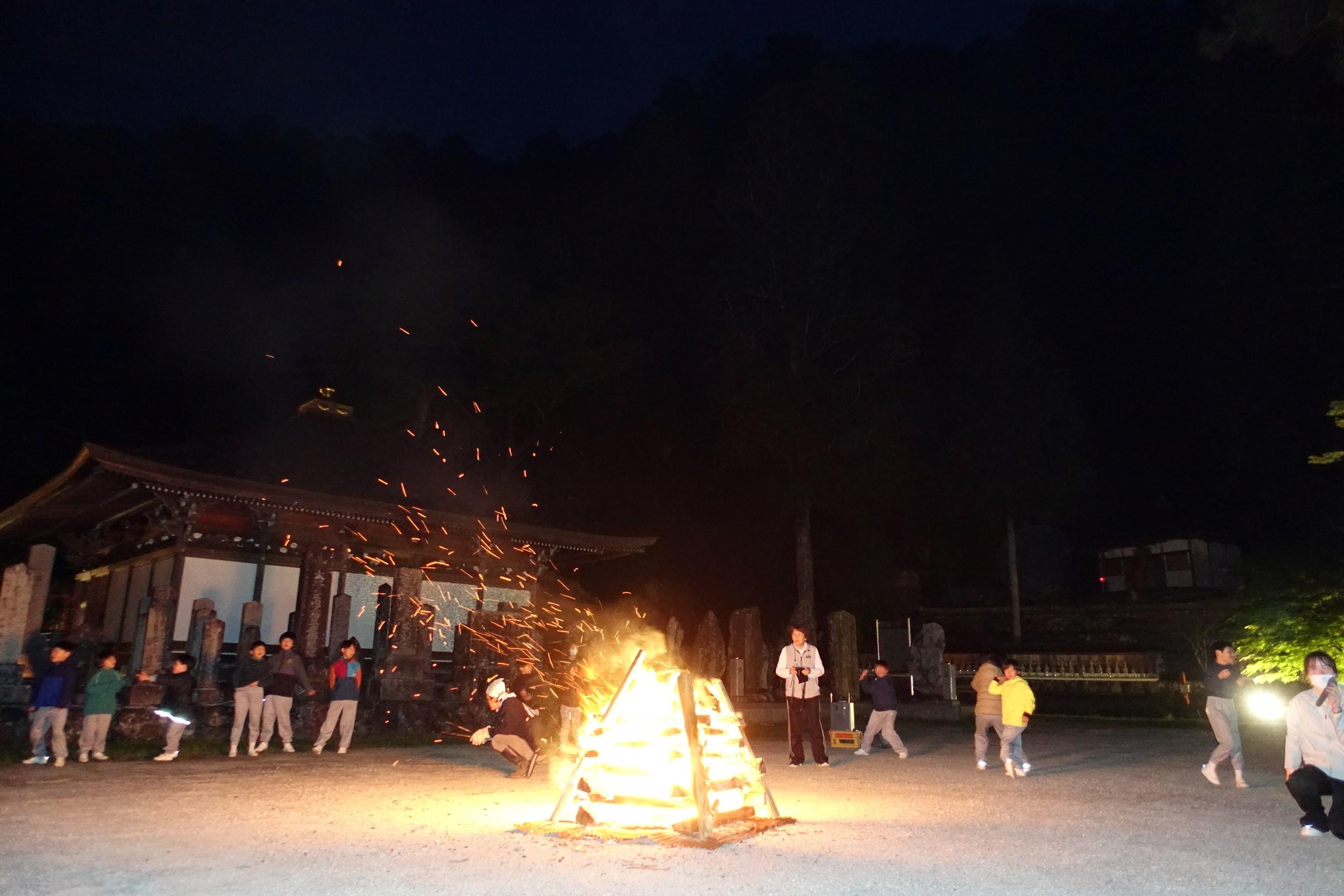 参拝後,奈良県にある洞川温泉の宿に向かい,温泉とおいしいご飯で元気を回復した後,キャンプファイアーを行いました。火の神に授けられた明るい炎の周りで,レクリエーションをして楽しいひと時を過ごしました。