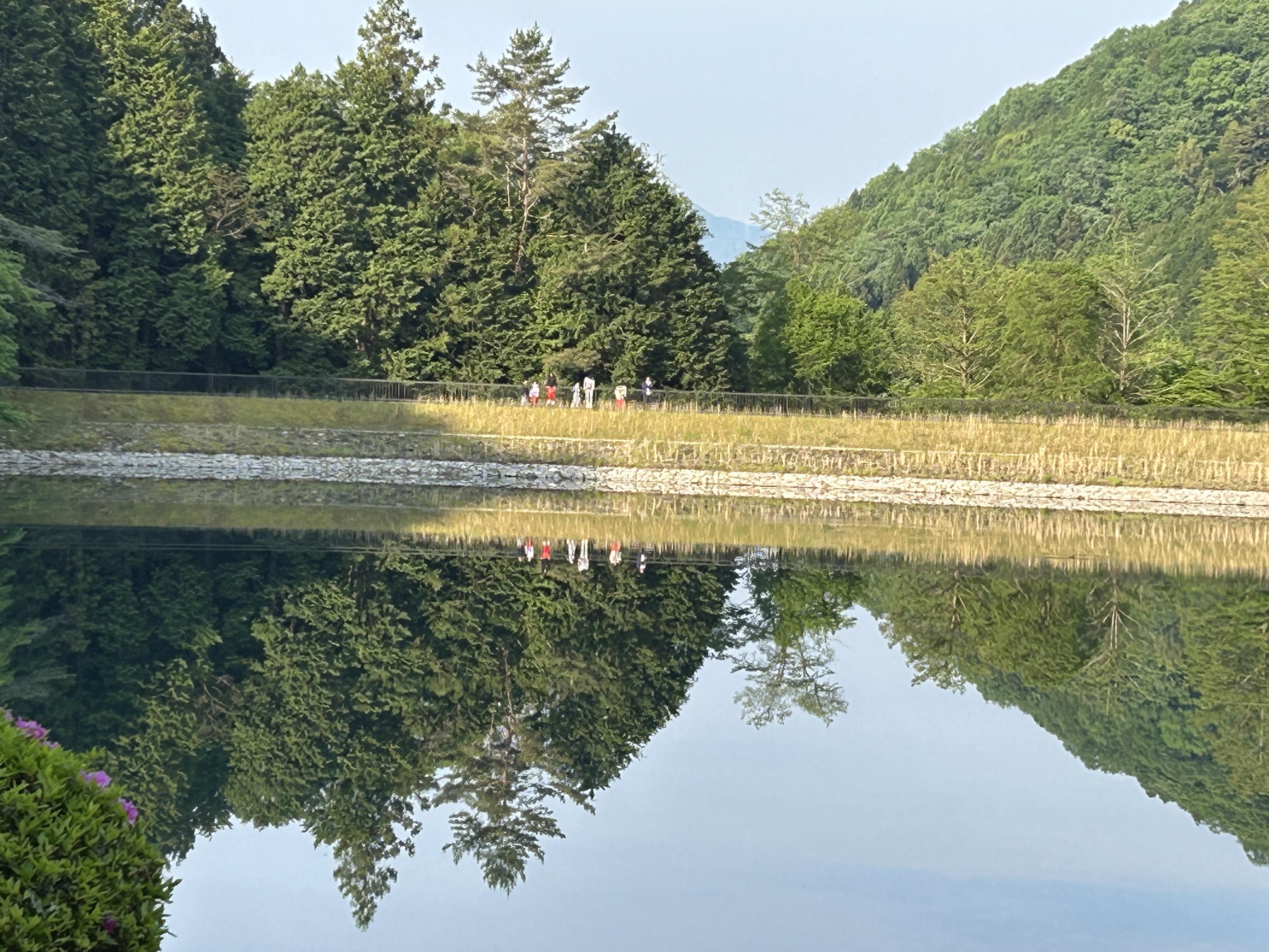 朝の集いのときには、水面に美しい自然が映し出される水鏡の風景が見られました。
