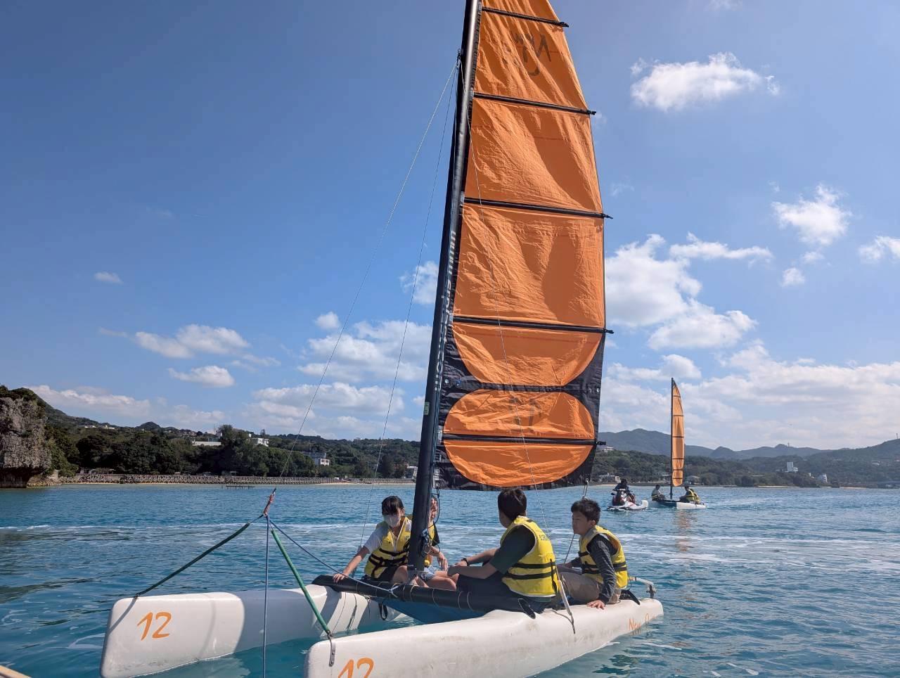 本日は「もとぶ元気村」にて海洋プログラムを楽しみました。午前中はコーラルビュークルージング・ドルフィンガイド・紅型体験をしました。お昼はカレーをいただき、午後からは、ヨット・サバニ・カヌーを体験。晴天に恵まれたなか、広く澄み切ったエメラルドグリーンの海で、全員元気に活動することができました。