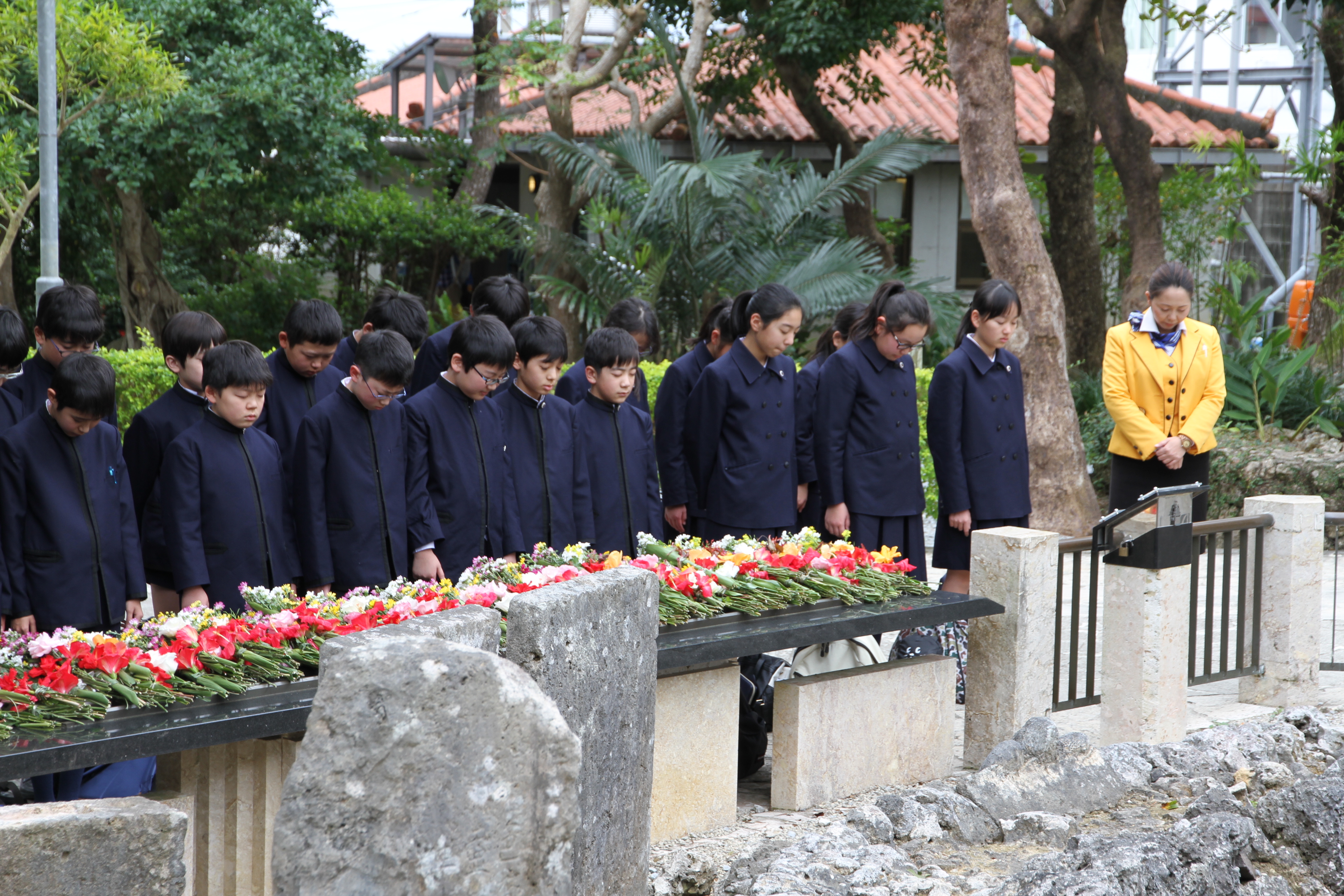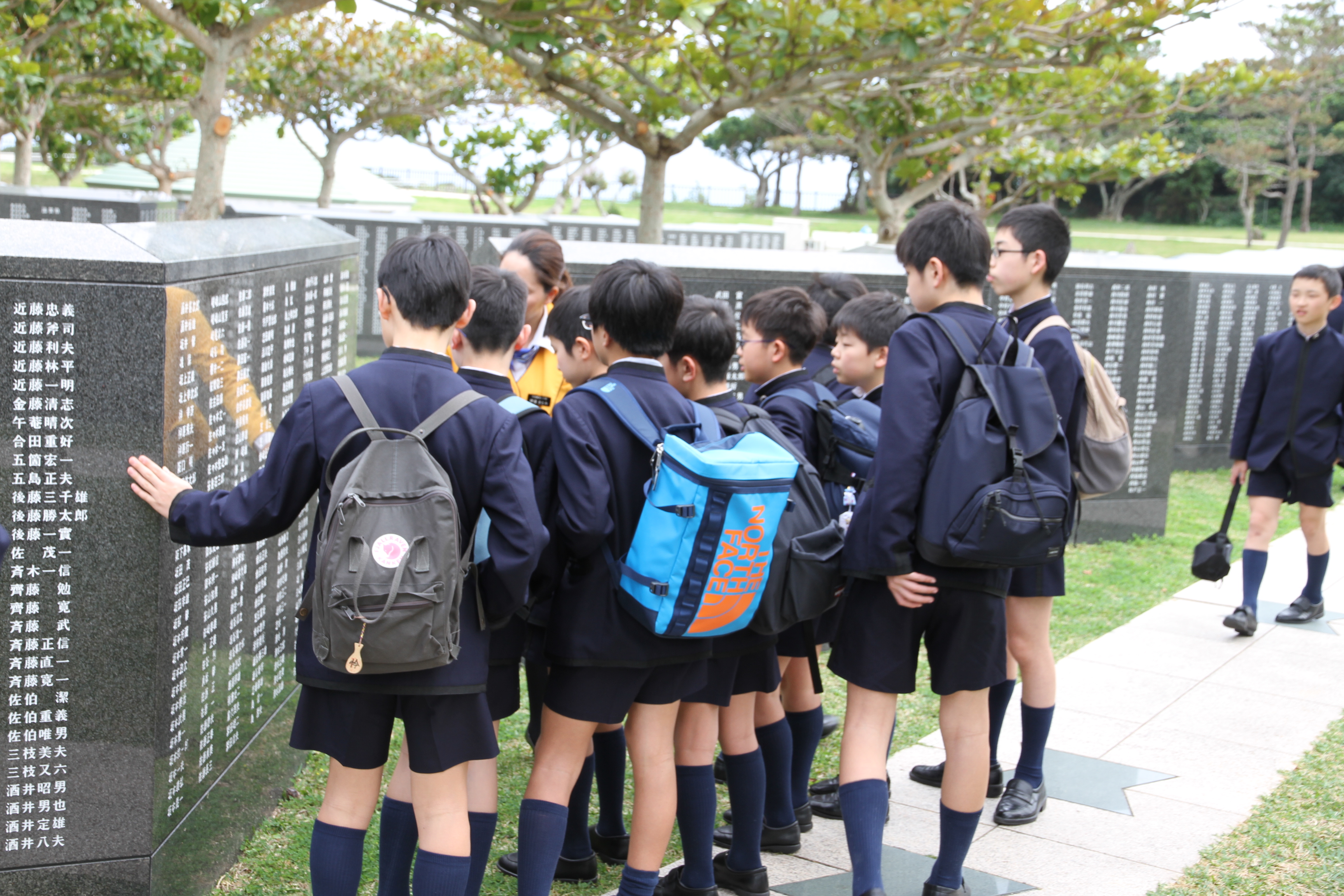 初日は,沖縄本島南部の戦跡地,「ひめゆりの塔」「平和祈念公園」などをめぐり,平和について学習しました。