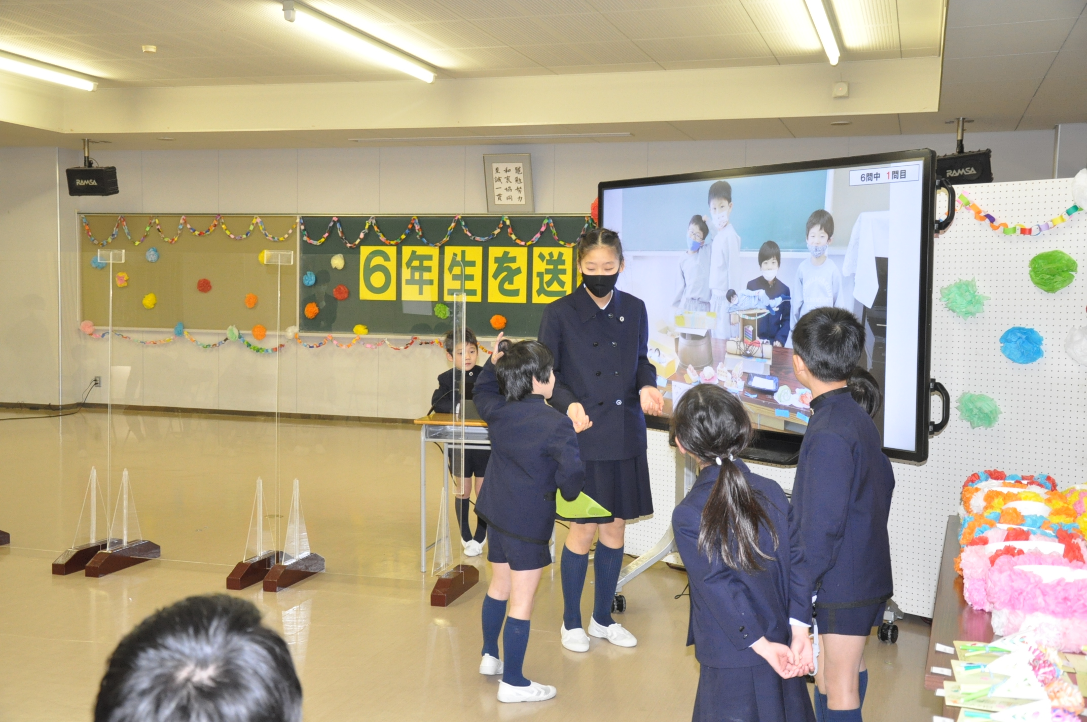「6年生を送る会」を行いました。学年ごとに出し物を考え、6年生に披露しました。クイズやダンス、プレゼントの贈呈、プログラミングを使って作成したスライドショーなど、さまざまなもので会を盛り上げました。笑顔で楽しむ6年生の姿が印象的でした。新型コロナウイルス感染症対策から、アクリル板を設置。また、保護者の皆様にはオンラインでご参観いただきました。