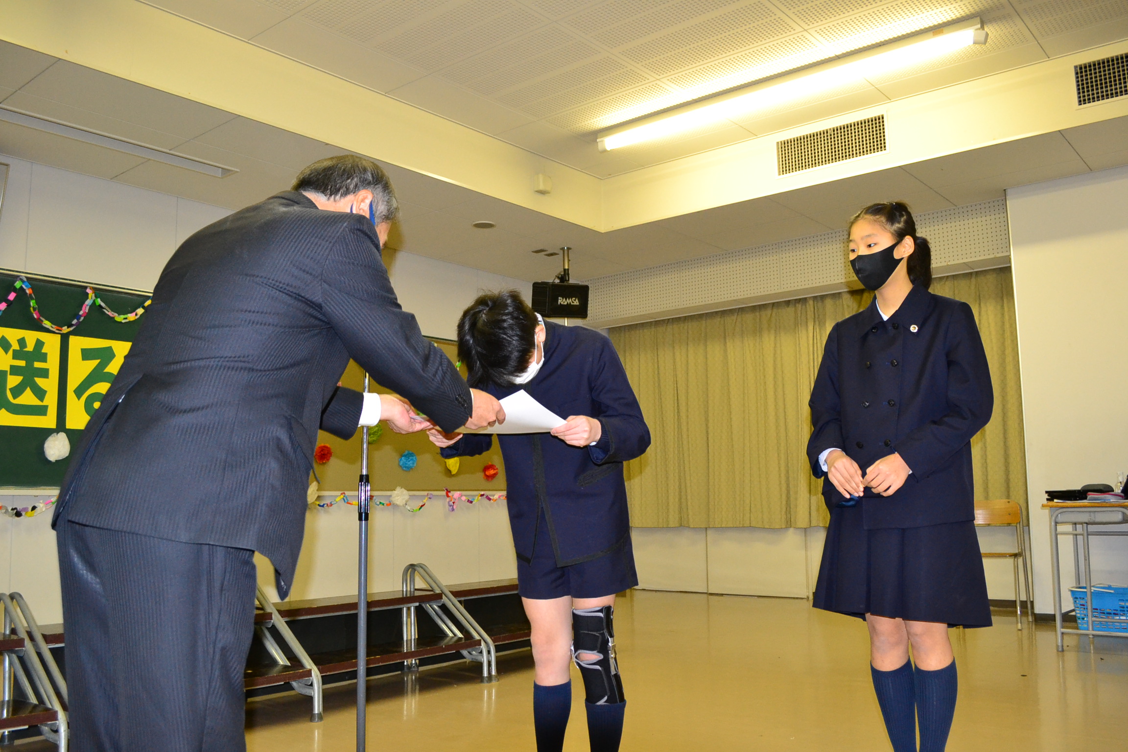 会終了後、習字クラブで「準優待生」に認定された6年生2名の表彰式を行いました。よくがんばりました。