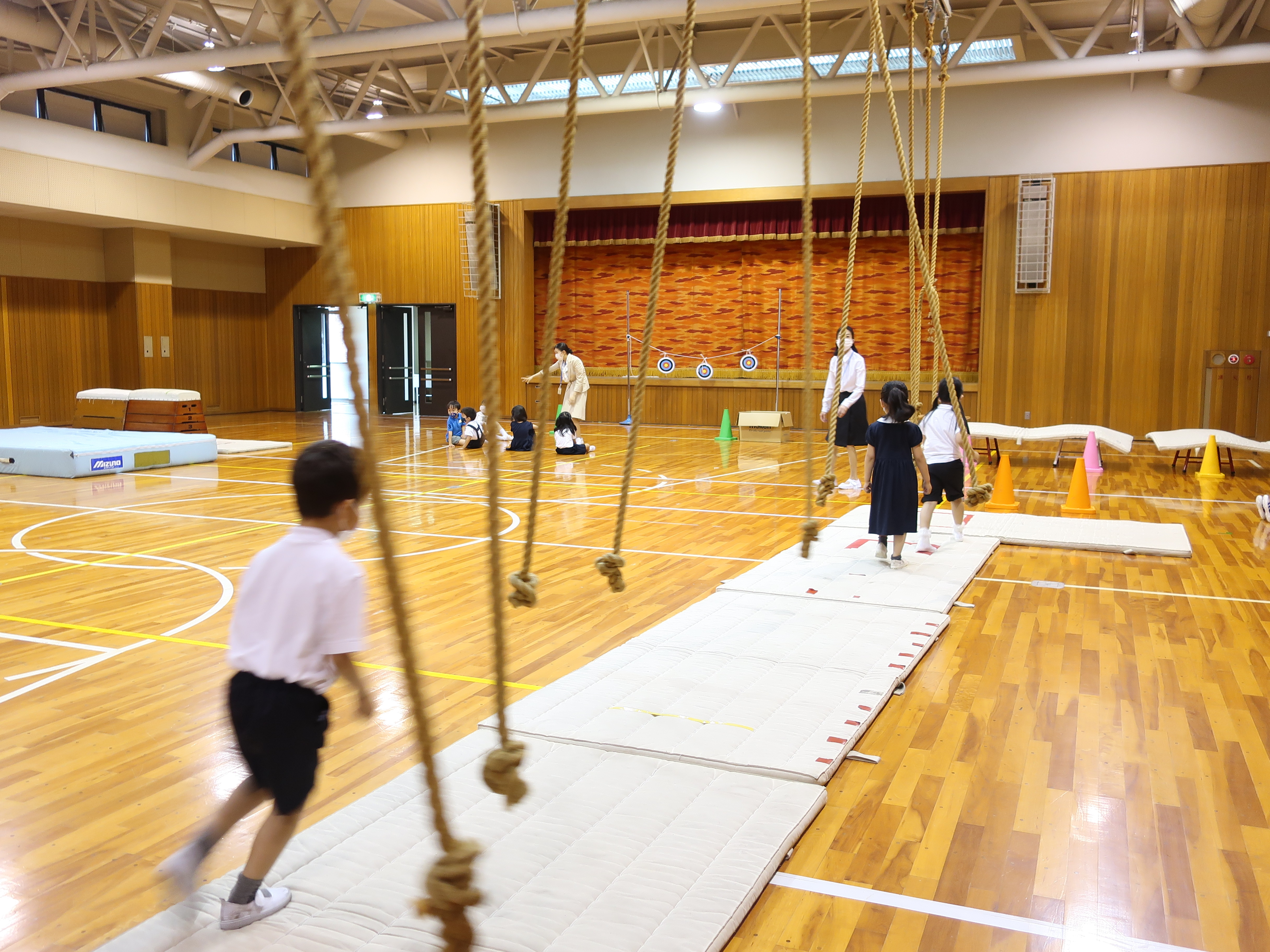 学校探検で校内のいろいろな教室でチャレンジをしました。園児たちは楽しみながら、アスレチックや図工、プログラミング学習を体験しました。