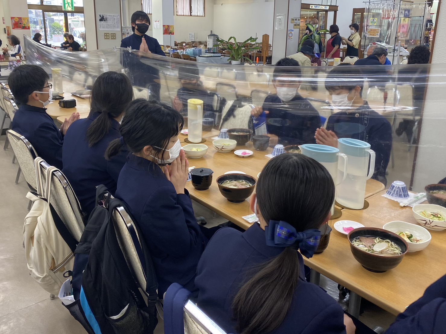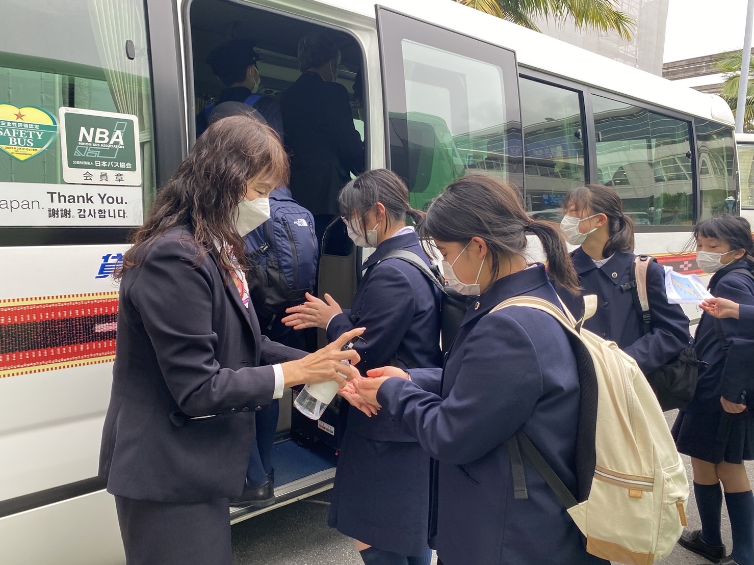 沖縄に到着しました。現地は暖かく、小雨の降る中でしたが、バスガイドさんの素敵なお話とともに移動し、充実した1日目となりました。本日は、ひめゆりの塔や平和祈念公園に行き、全員が平和について真剣に学習しました。それぞれが思い思いの気持ちを綴る場面もみられました。お昼は沖縄そばをいただきました。夕方には宿泊先のマリンピアザオキナワに到着しました。