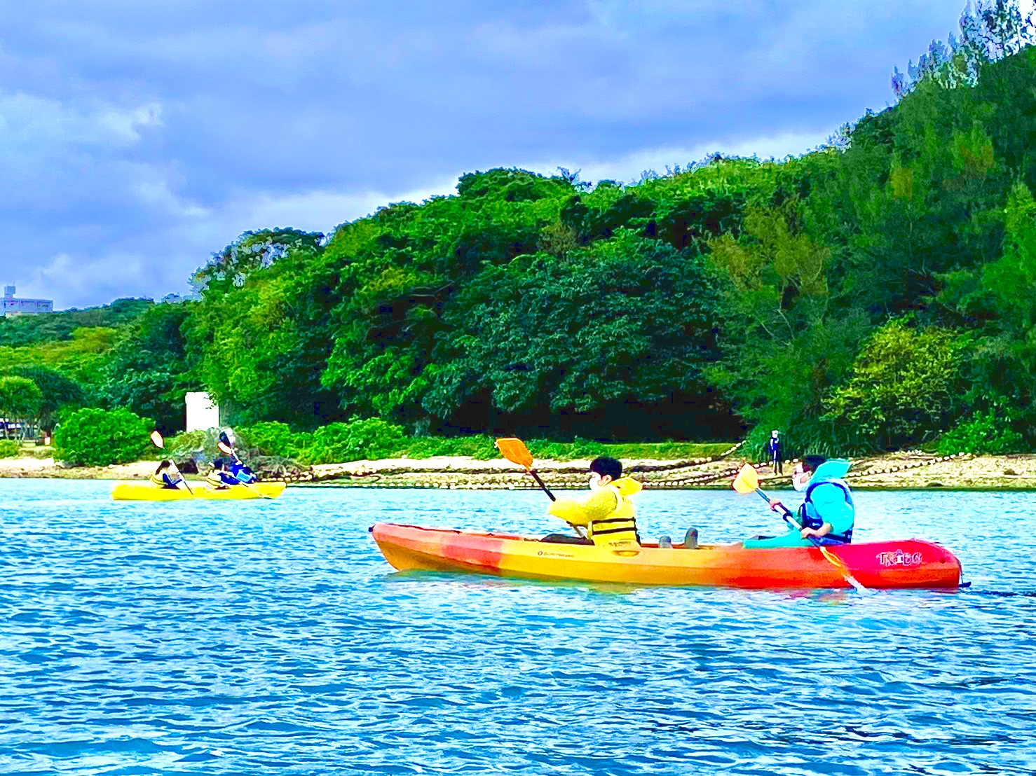 本日は朝から「もとぶ元気村」に滞在し、1日かけてプログラムを楽しみました。午前中はジェルキャンドル・フォトフレーム・サンゴ風船作りをしました。お昼はカレーをいただきました。午後からはドルフィンガイド・サバニ・カヌーと、多くの体験学習ができました。青い海と豊かな自然のなか、全員で元気に活動することができました。
