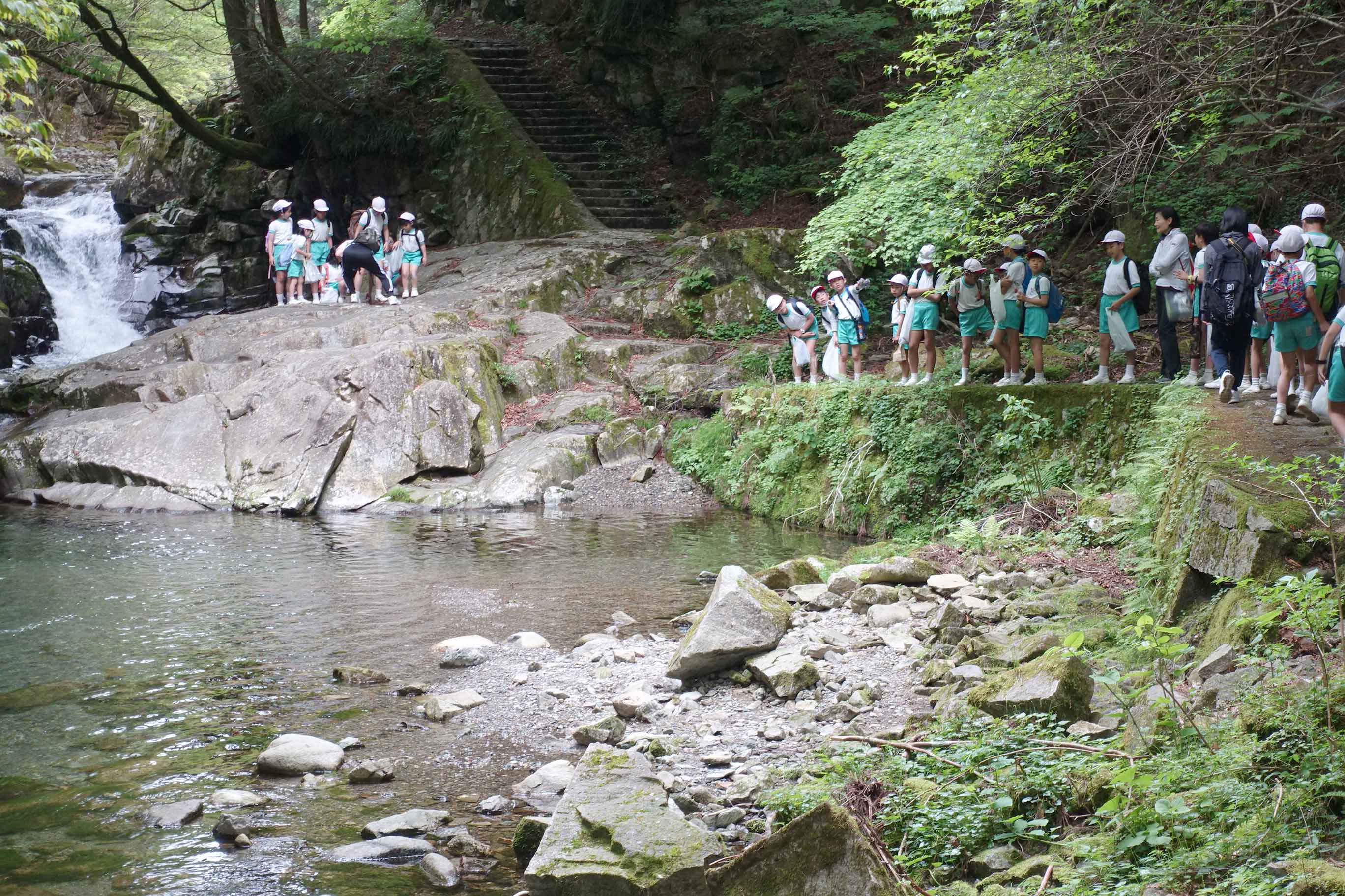 昼食後は橋までもどってハイキング再開。展望台,エコミュージアムと進み,かじかの滝でゴールイン。帰り道に寄って飲んだ湧き水「ごろごろ水」は,とてもおいしかったです。