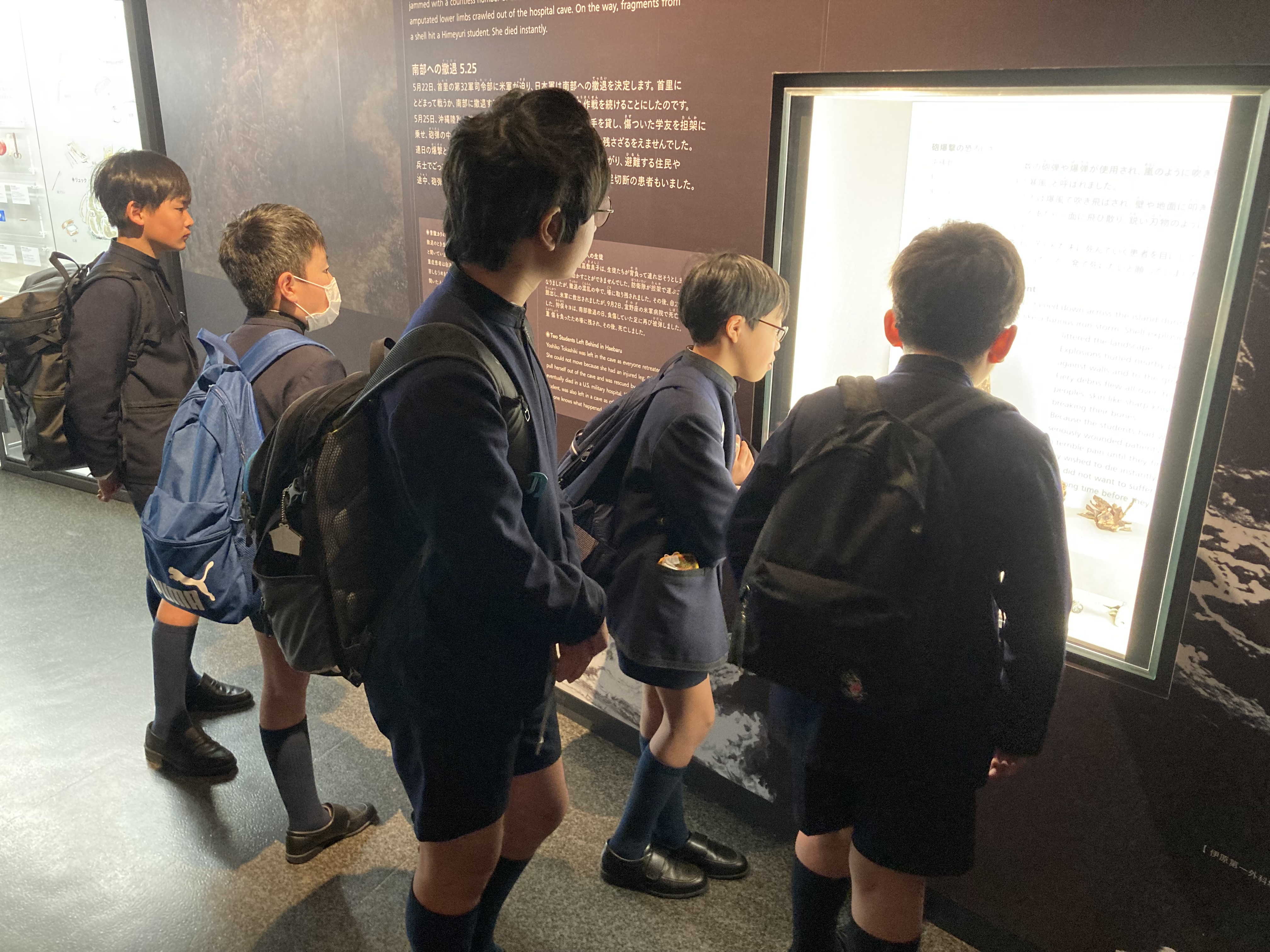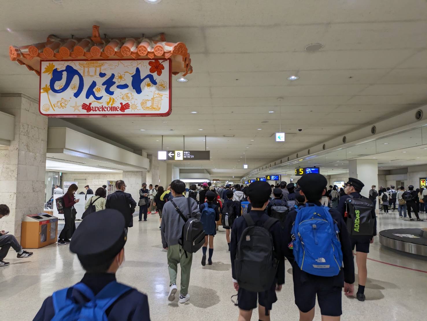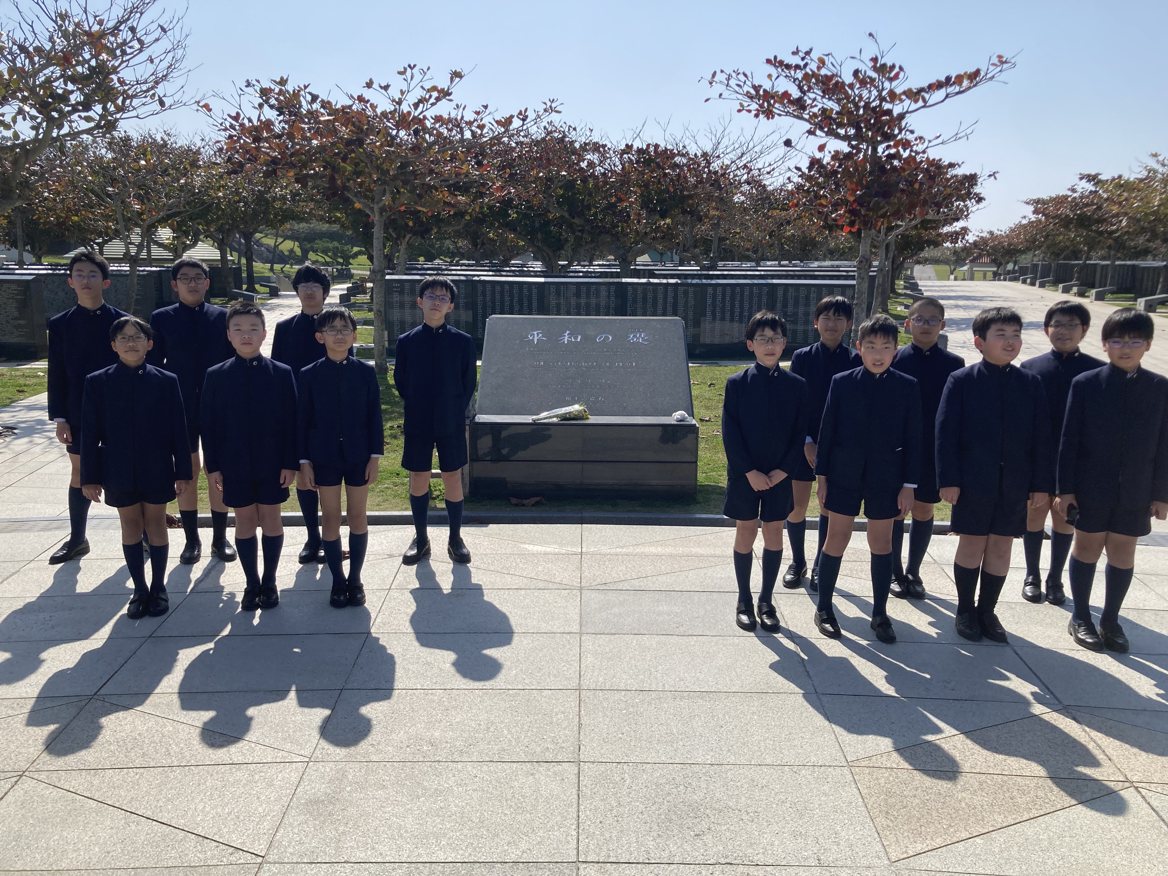 沖縄に到着しました。現地は暖かく、沖縄らしい晴天に恵まれました。バスガイドさんの素敵なお話とともに移動し、充実した1日目となりました。本日は、ひめゆりの塔や平和祈念公園に行き平和学習を行いました。戦争で亡くなった方々に想いを馳せ、祈りを捧げました。平和祈念資料館では真剣に展示物を見る児童の姿が印象的でした。お昼には沖縄そばをいただき、夕方には宿泊先のマリンピアザ沖縄に到着しました。