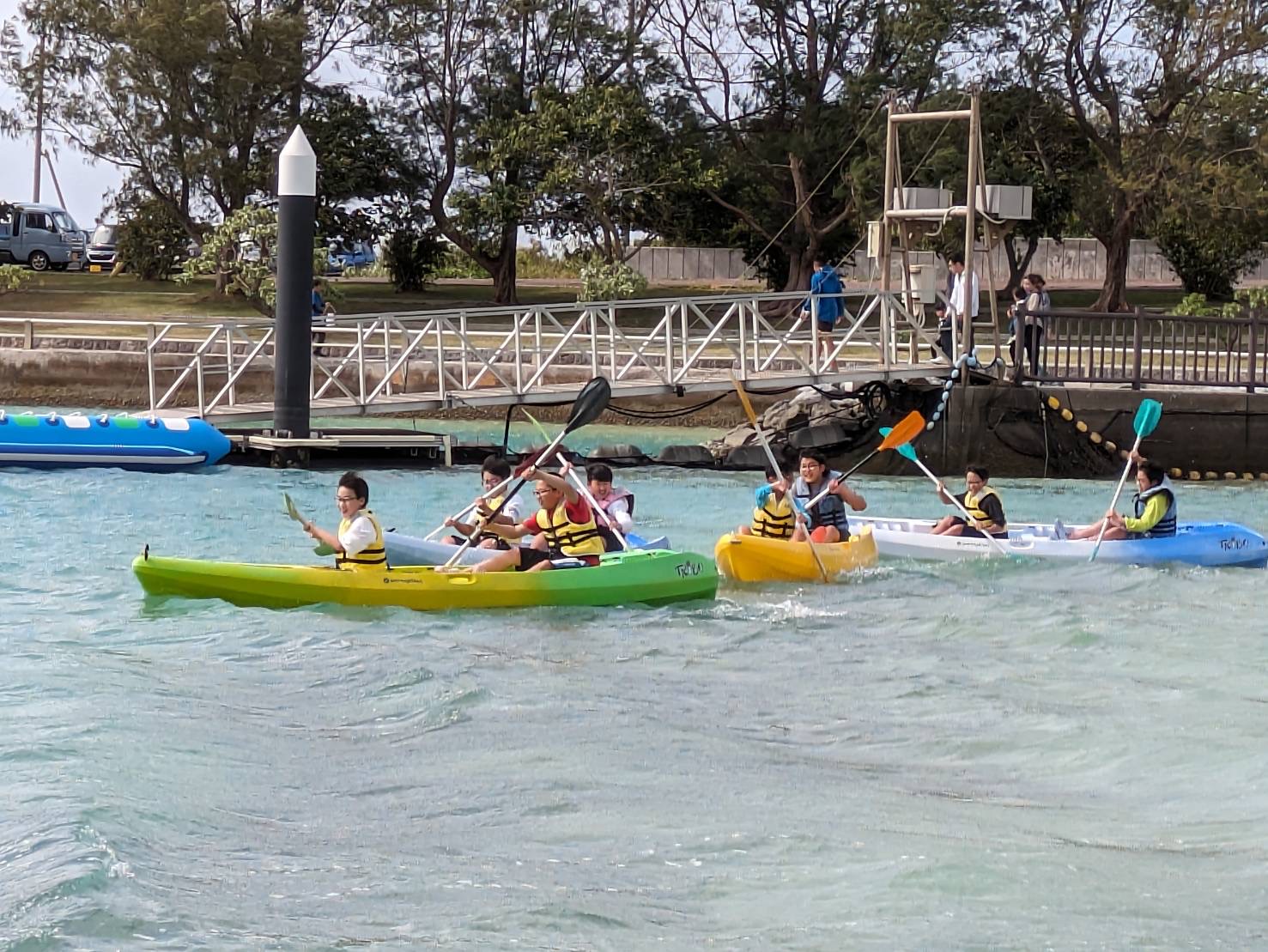 本日は朝から「もとぶ元気村」に滞在し、1日かけて海洋プログラムを楽しみました。午前中はドルフィンガイド・コーラルビュークルージング・サンゴ風鈴作りをしました。お昼はカレーをいただき、午後からは、カヌー・サバニ・バナナボートを体験しました。その後干潮の浜辺で生き物探しを行い、ホテルに帰ってからもバドミントンや卓球などを楽しみました。青い海と豊かな自然のなか、全員で元気に活動することができました。
