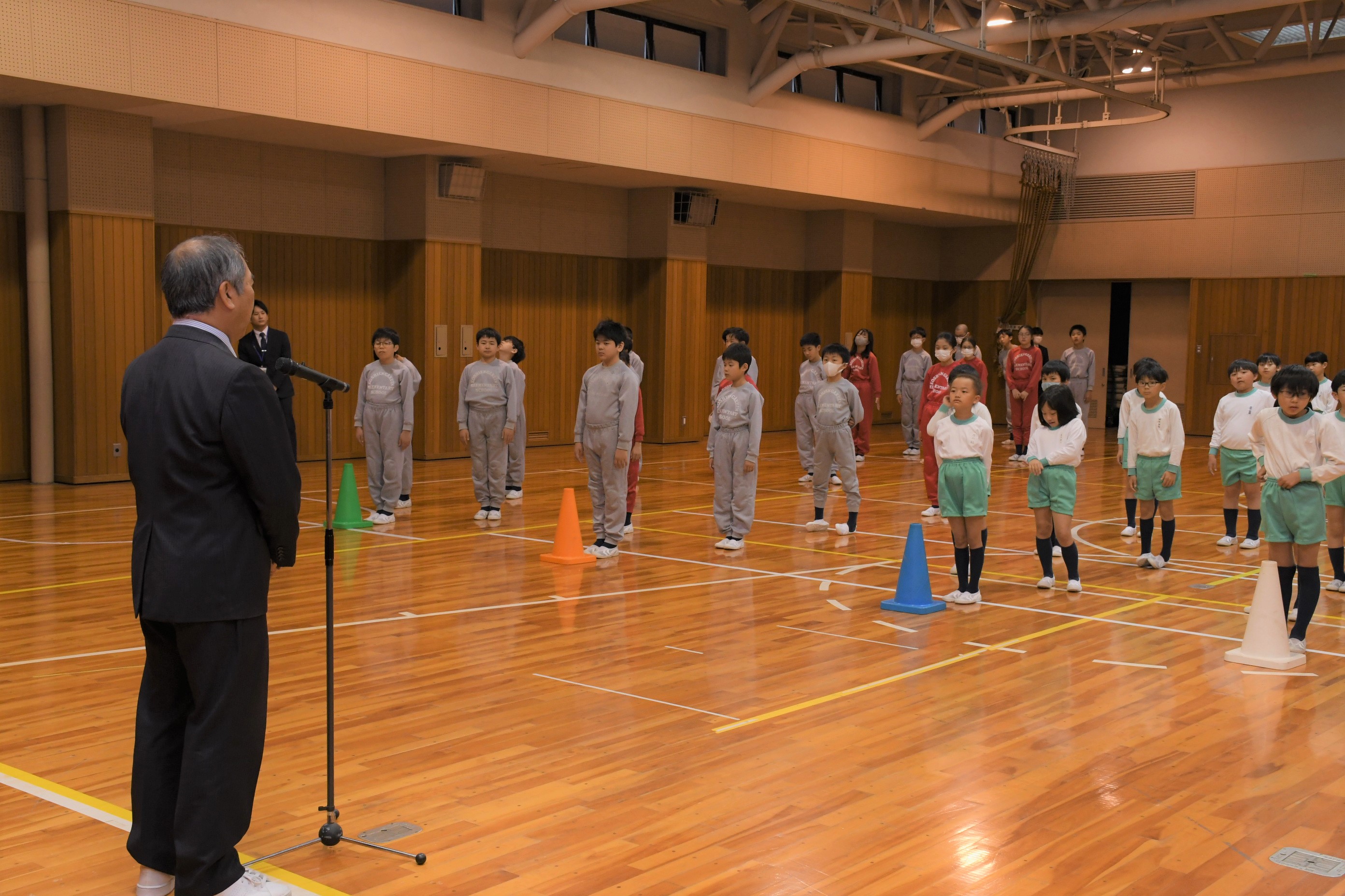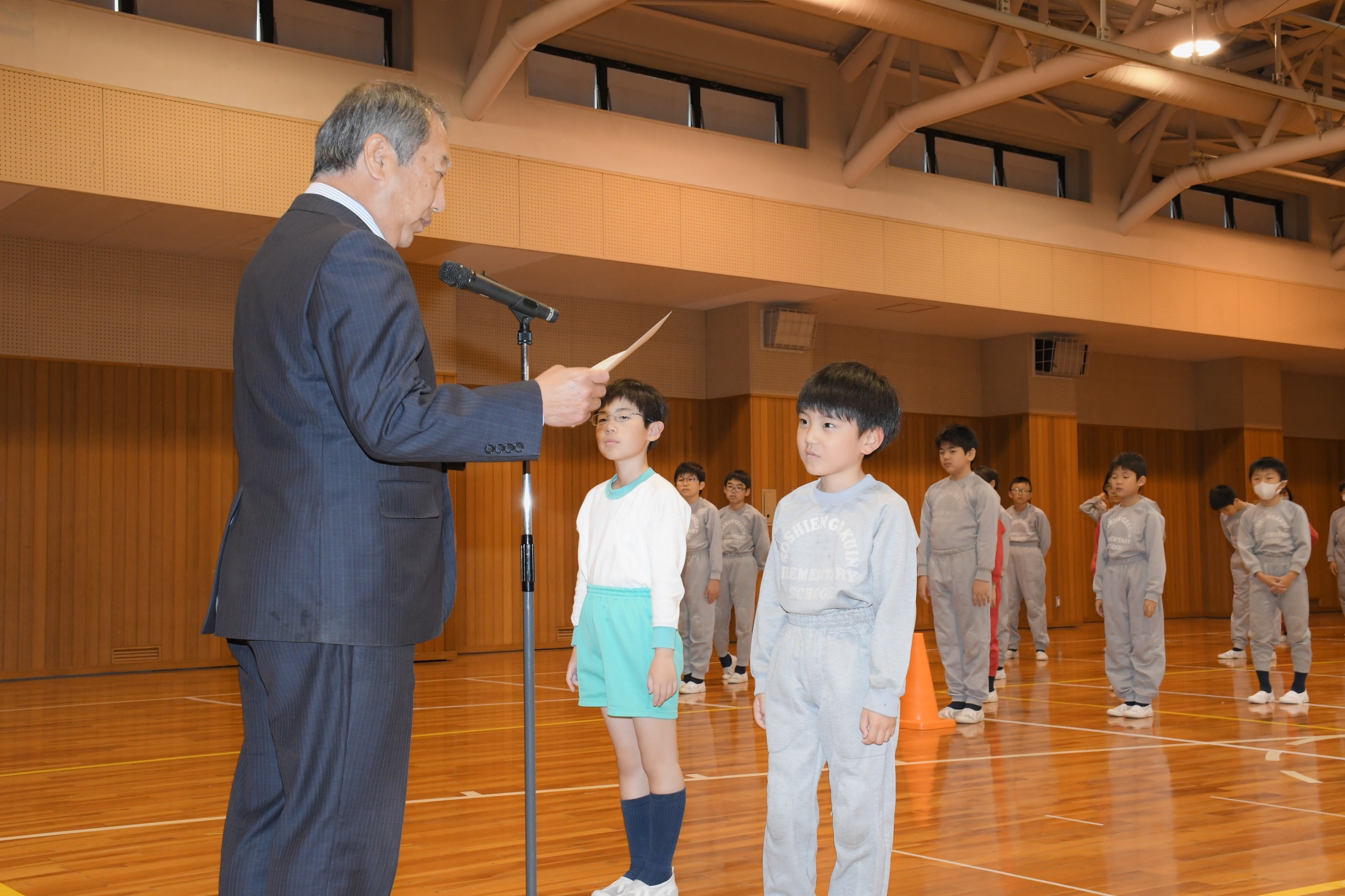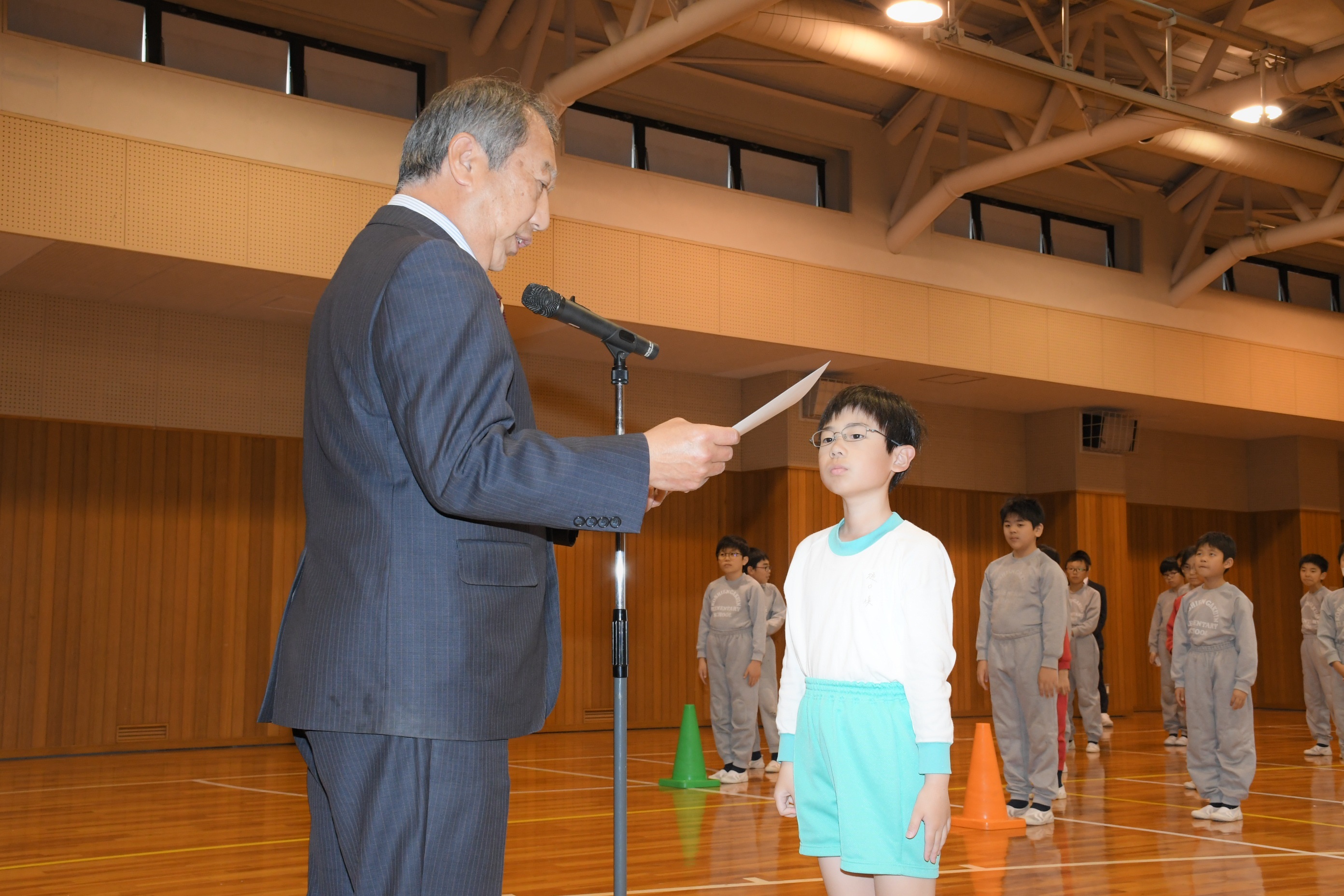 児童朝礼にて、剣道と漢字検定における児童の表彰を行いました。また、校長先生から5月1日の創立記念日についてのお話を聞きました。