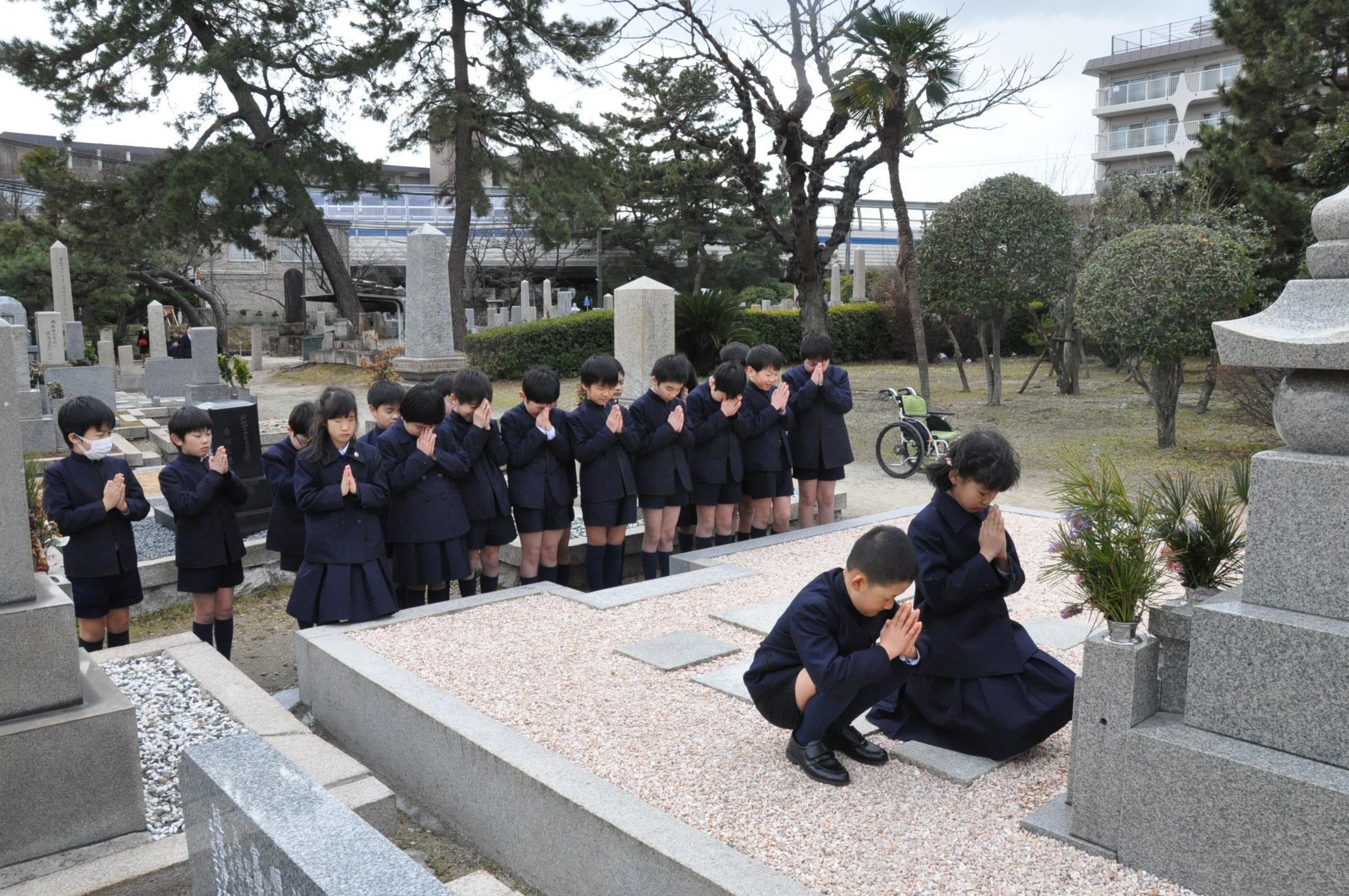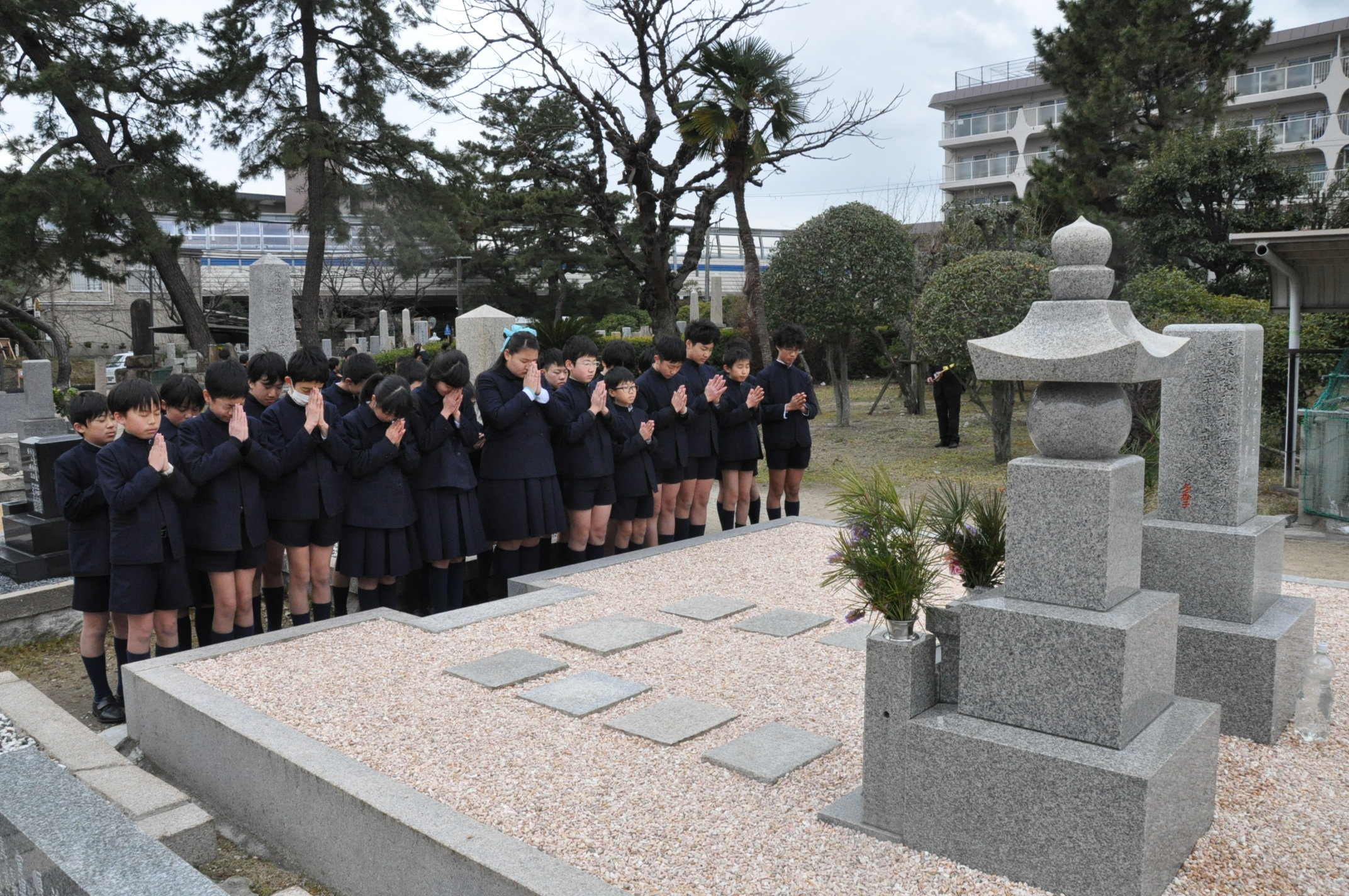 校祖先生と前学院長先生のお墓にお参りに行きました。先生方のご遺徳を偲んだ後、甲子園学院小学校の児童として、しっかり勉学に励むことをお誓いしました。