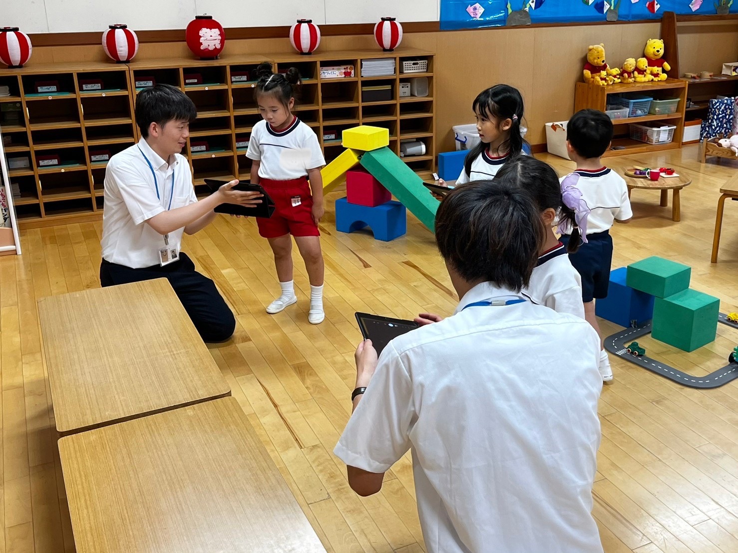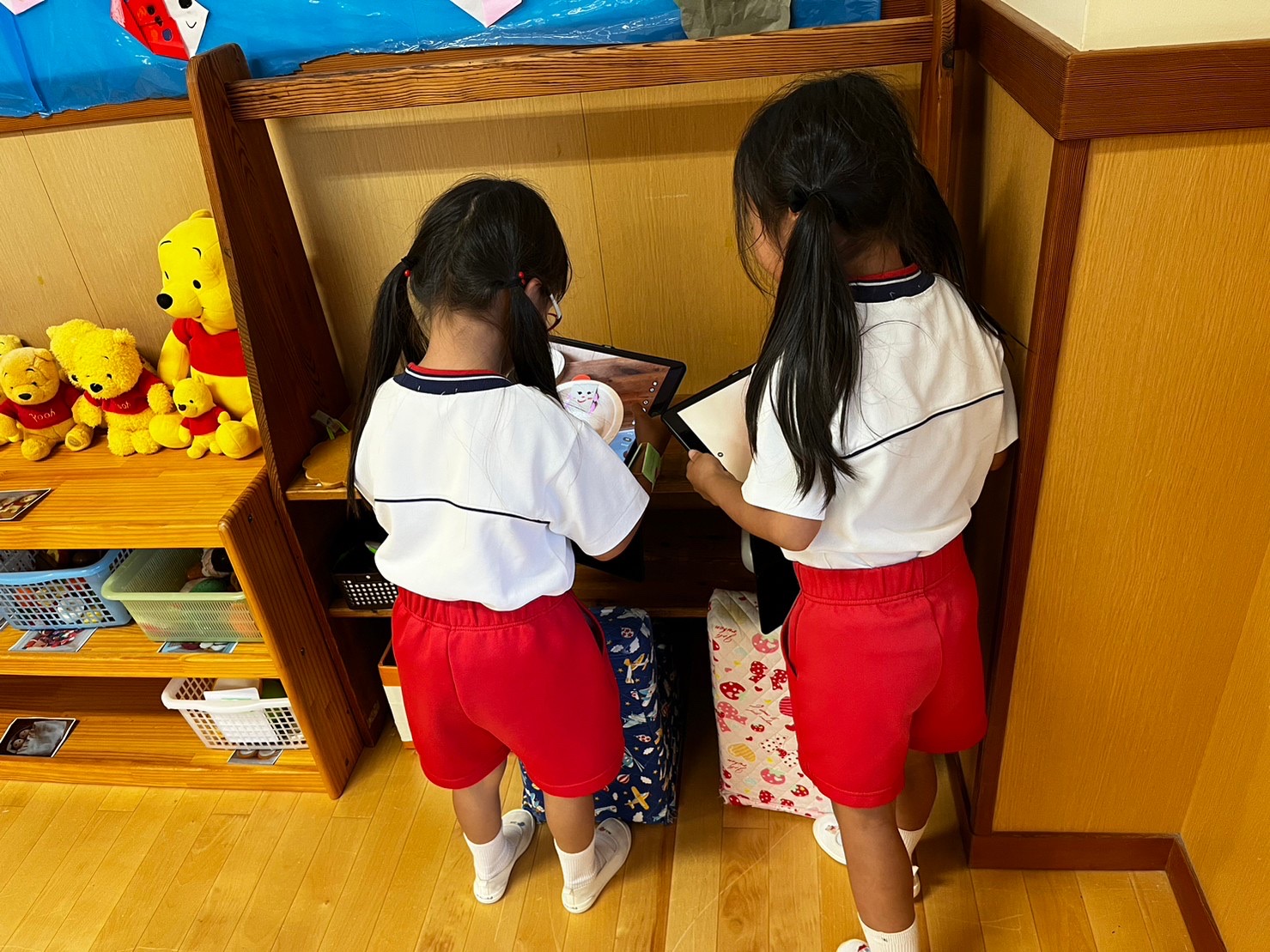 小学校の部屋は「すきまちゃんを見つけよう」というテーマ。保育室の中に隠れているすきまちゃんを見つけて、タブレットで写真を撮影する活動でした。参加した年長児たちは、上手にタブレットを使いこなし、みんな撮影に成功しました。